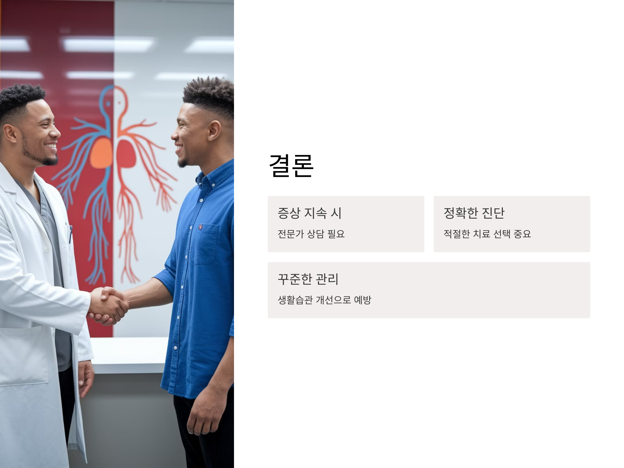 - 생활습관 개선: 금연, 적절한 운동, 식이 요법 등이 매우 중요합니다.