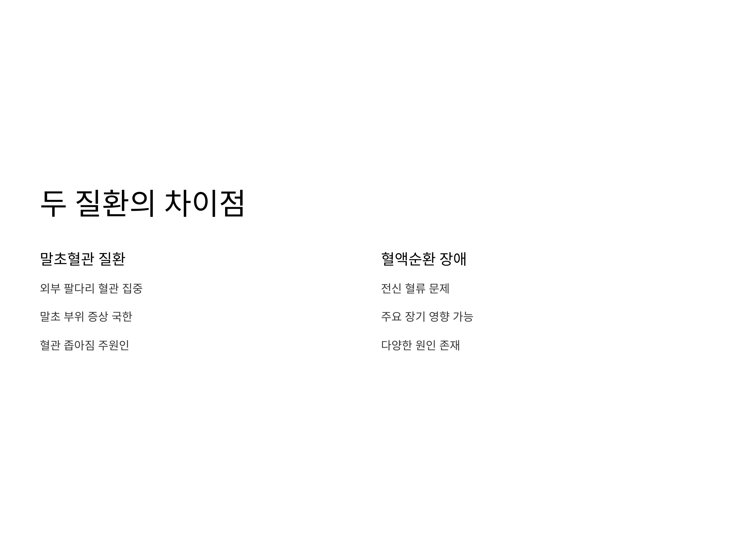 말초혈관 질환과 혈액순환 장애는 모두 혈류에 문제가 생긴다는 점에서 유사하지만, 그 발생 부위와 원인에 차이가 있습니다. 말초혈관 질환은 주로 말초 혈관에 국한된 문제로, 혈관이 좁아지거나 막혀 혈액이 제대로 흐르지 않는 상황입니다. 반면, 혈액순환 장애는 전반적으로 혈액이 신체 곳곳에 제대로 공급되지 못하는 상태를 말합니다.