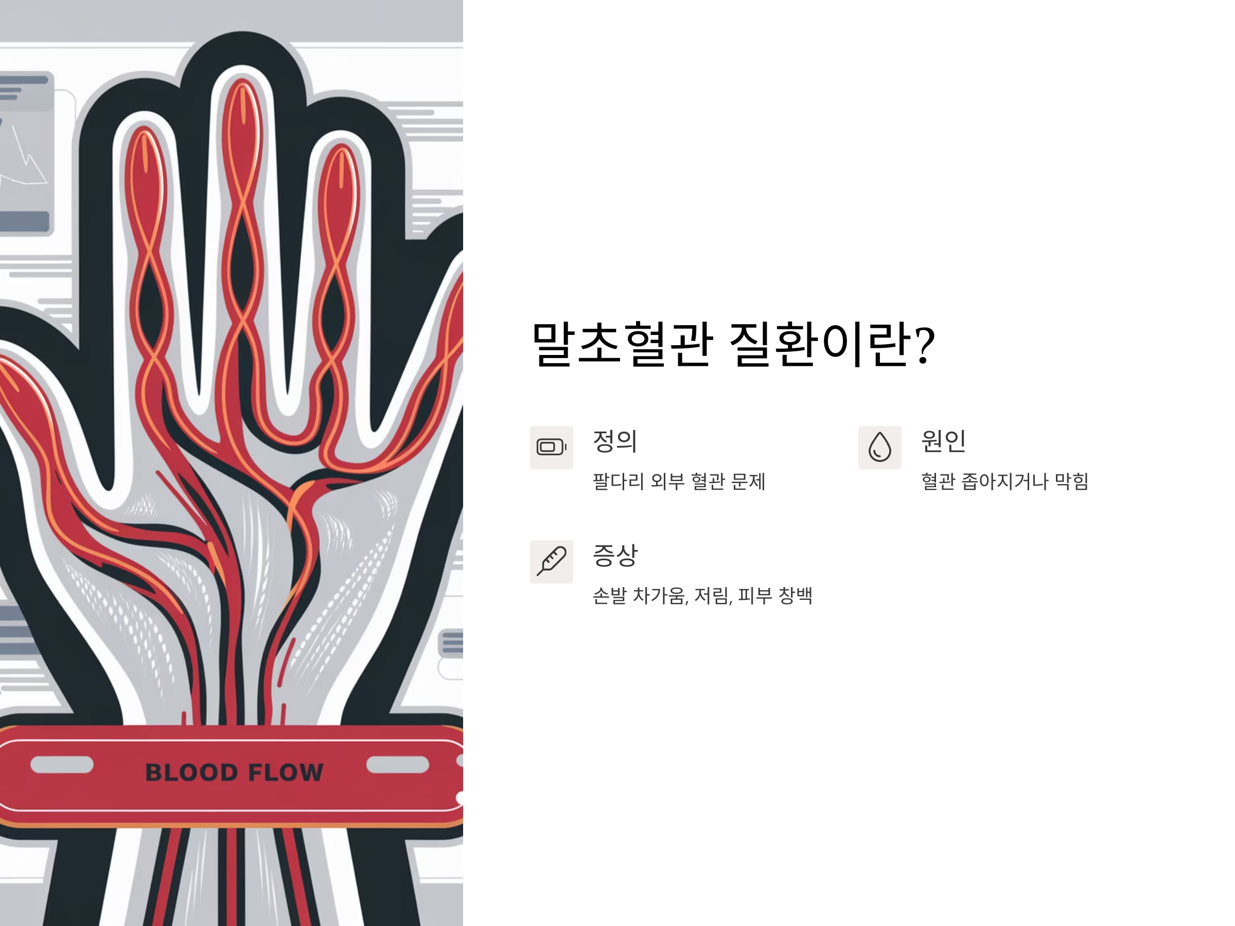 따라서 말초혈관 질환은 손끝과 발끝의 저림, 차가움 등 외부 부위에 집중된 증상을 보이며, 혈액순환 장애는 좀 더 전반적인 증상을 동반할 수 있습니다.