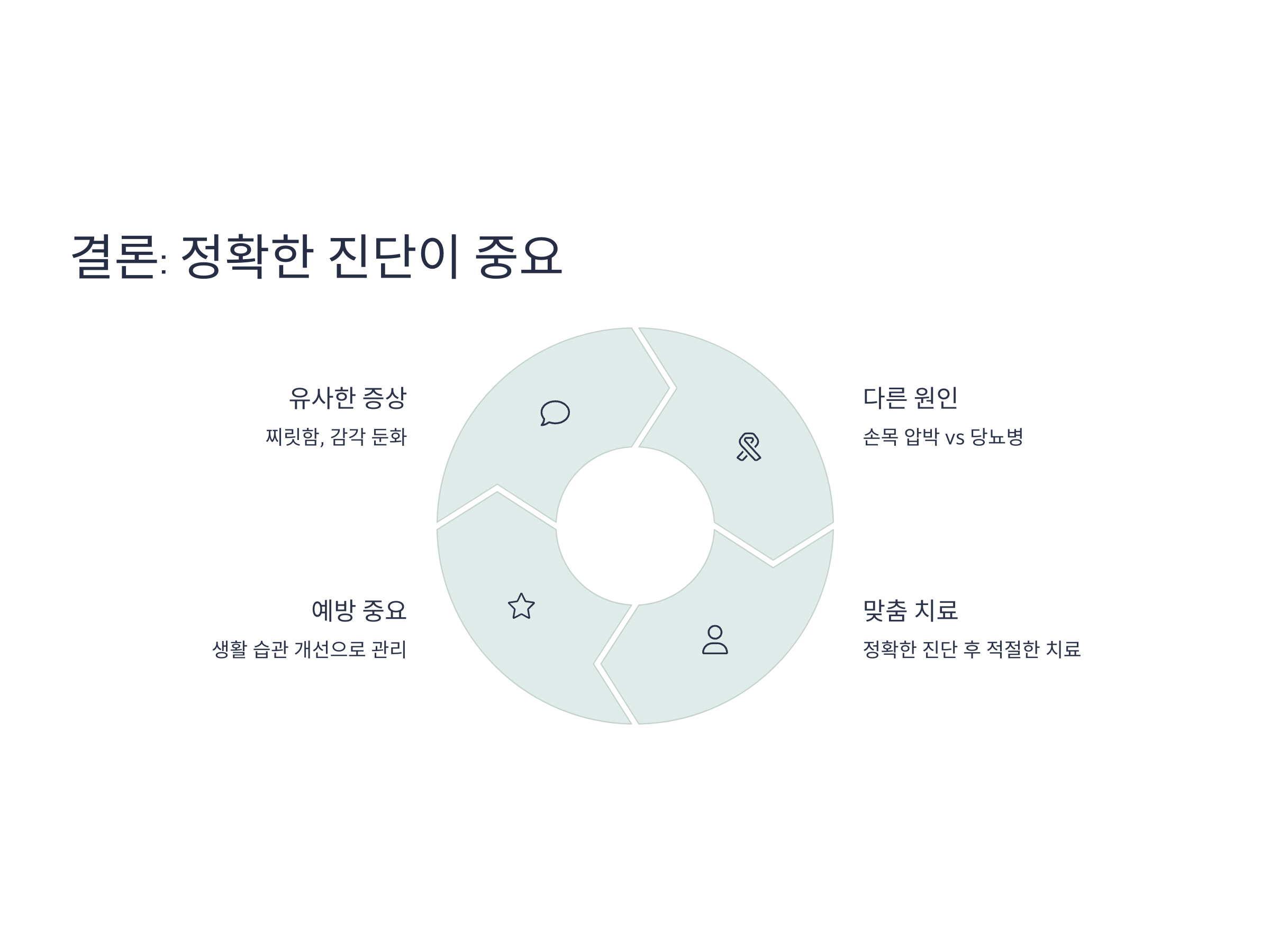 손목터널증후군과 당뇨병성 신경병증은 증상에서 유사한 점이 있지만, 그 원인과 발생 위치에 차이가 있습니다. 손목터널증후군은 주로 손목에서 발생하는 압박으로 인해 손가락 끝에 찌릿한 증상이 나타나며, 반복적인 손목 사용이 주요 원인입니다. 반면, 당뇨병성 신경병증은 당뇨병으로 인해 발생하며, 주로 말초신경이 영향을 받습니다. 이는 손과 발의 끝에 증상이 나타나는 경향이 있습니다.