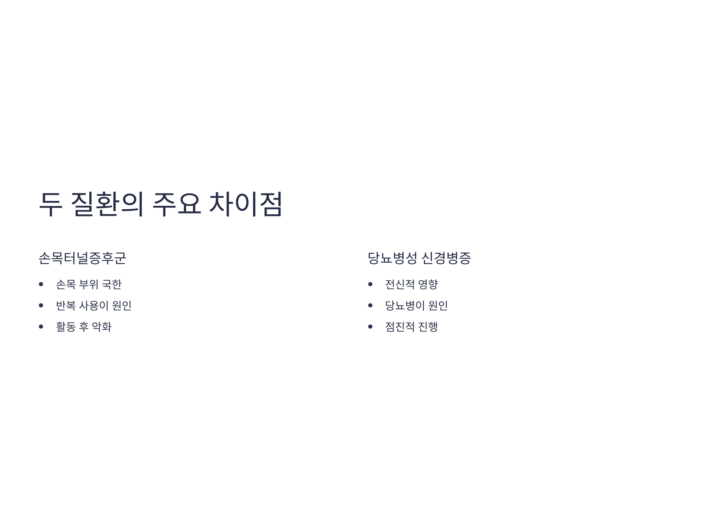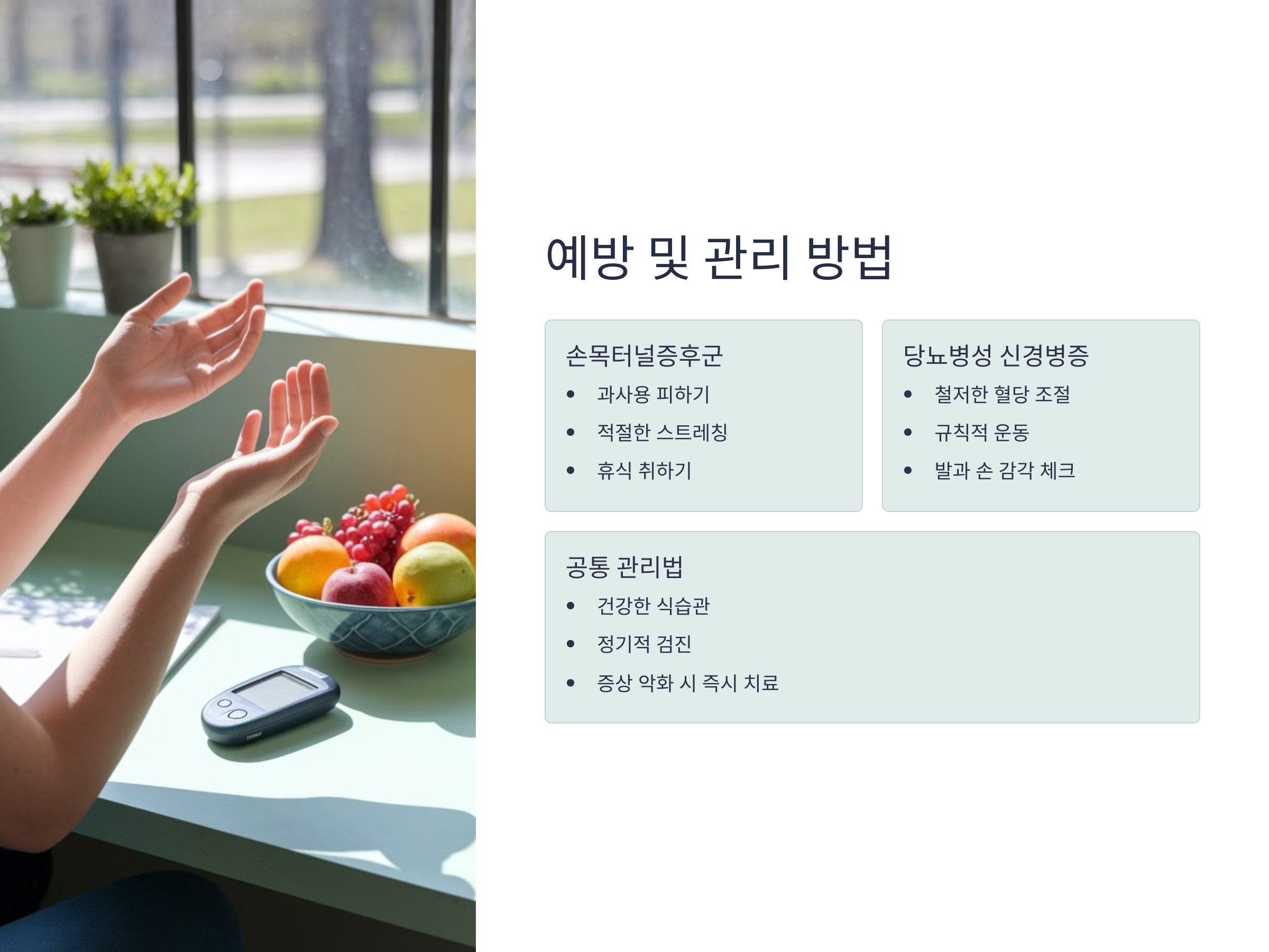 손목터널증후군은 보통 정확한 부위에서 증상이 발생하고, 활동 후에 증상이 악화되는 경향이 있습니다. 당뇨병성 신경병증은 전신적으로 영향을 미칠 수 있으며, 증상이 점차적으로 진행되는 특성이 있습니다.