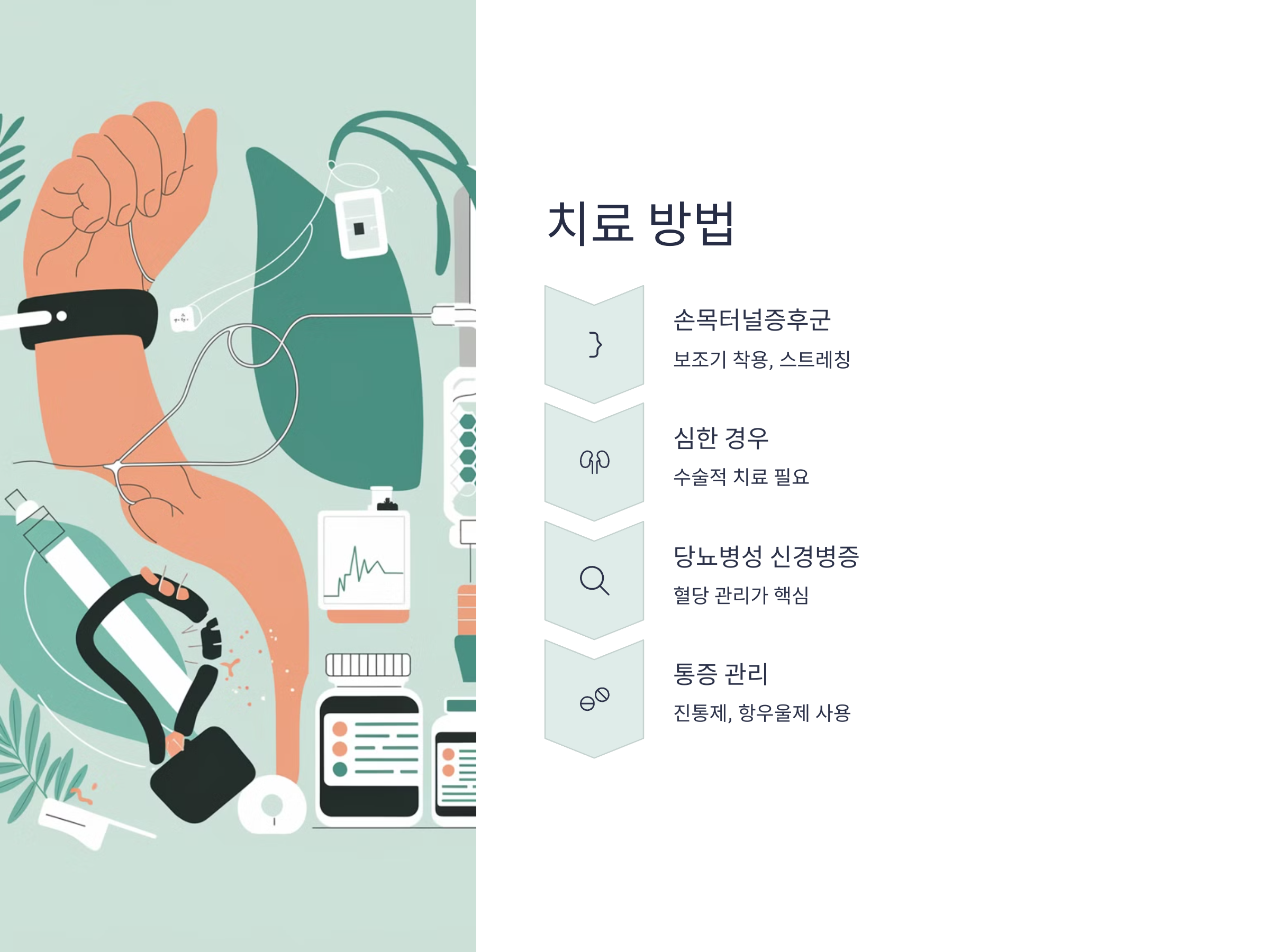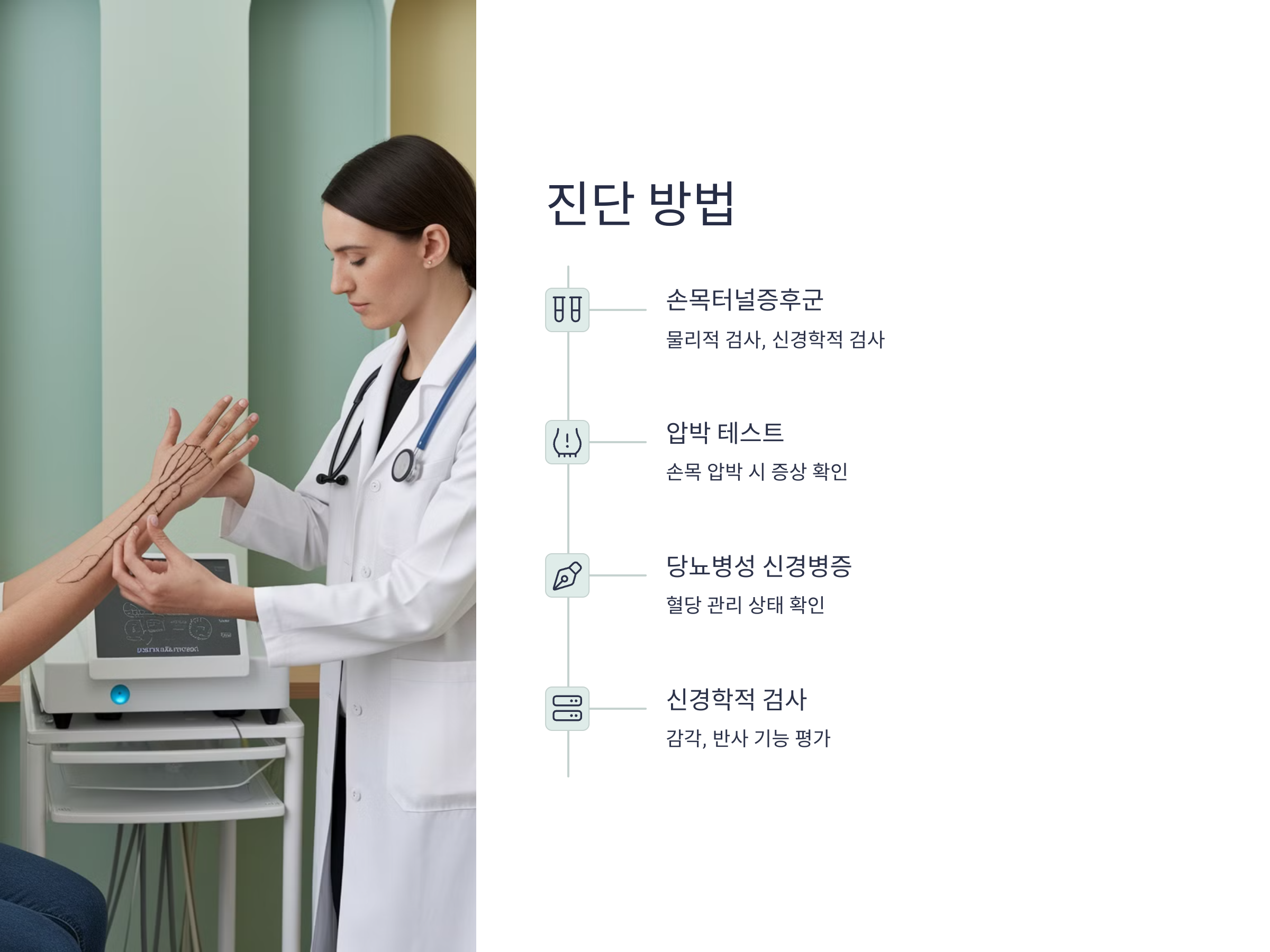 손목터널증후군의 진단은 주로 신경학적 검사나 손목의 압박 테스트를 통해 이루어집니다. 치료는 초기에 증상이 경미할 경우 보조기 착용이나 손목 스트레칭을 통해 증상이 개선될 수 있습니다. 그러나 증상이 심해지면 수술적 치료가 필요할 수 있습니다.