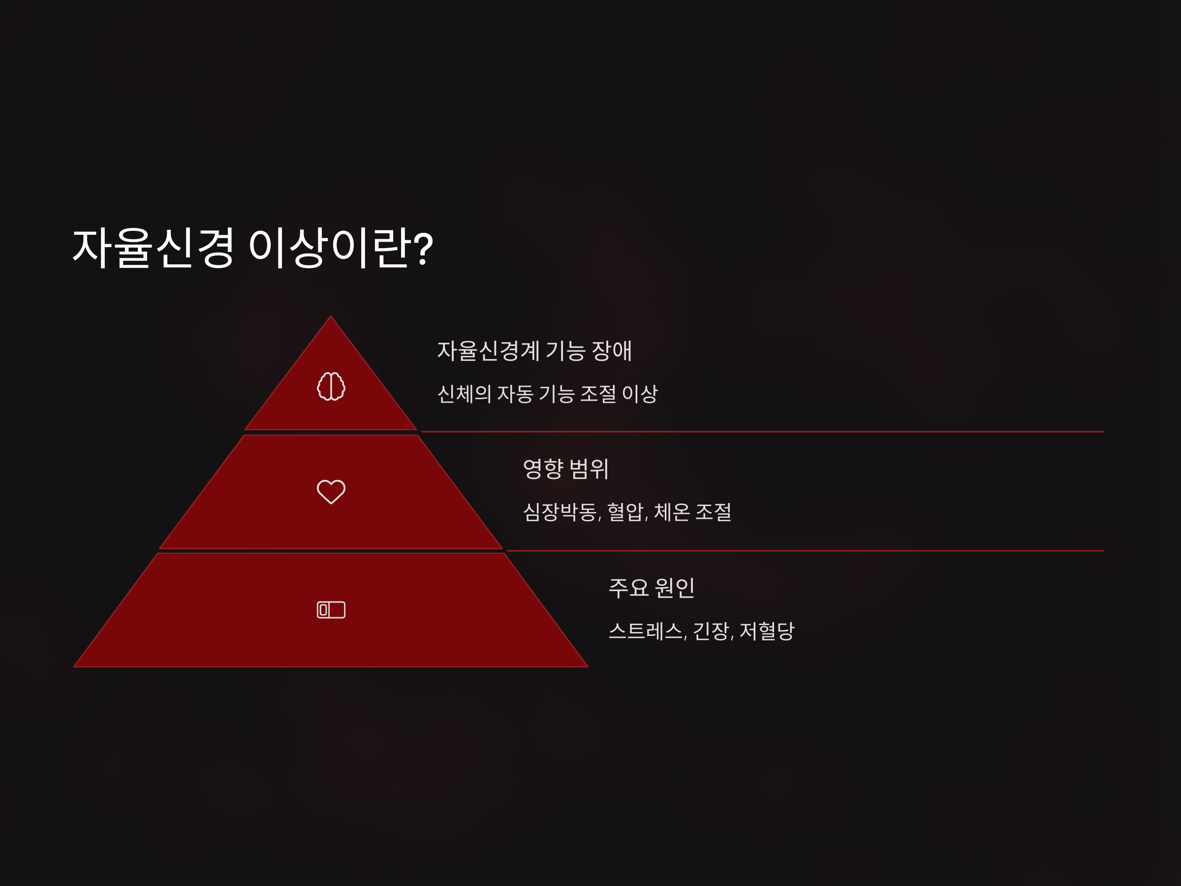 자율신경계는 몸의 여러 기능을 자동으로 조절하는 역할을 합니다. 이 시스템에 문제가 생기면 체내 온도 조절, 혈압 유지, 심장박동 수 등이 불규칙해질 수 있습니다. 이로 인해 손끝이나 발끝이 창백해지거나 차가운 증상이 발생하며, 종종 현기증이나 피로감 등의 증상도 동반됩니다. 자율신경 이상은 스트레스가 주요 원인으로 작용할 수 있기 때문에, 정신적인 스트레스나 과도한 신경 사용이 증상을 악화시킬 수 있습니다.