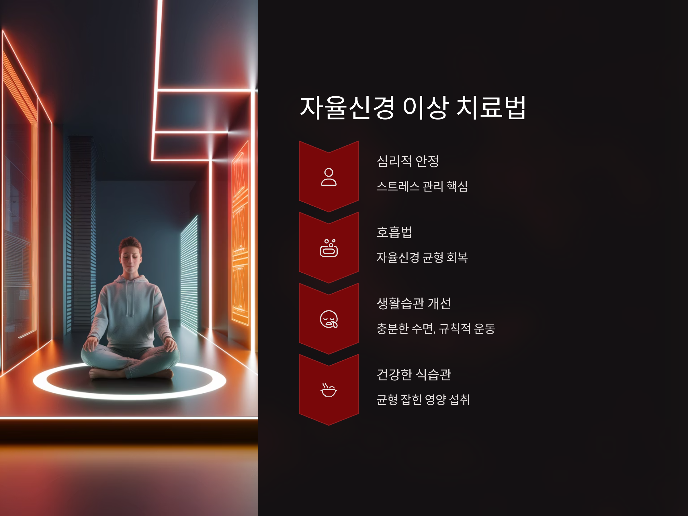 자율신경 이상은 자율신경계의 균형을 맞추기 위한 치료가 필요합니다. 심리적 안정과 스트레스 관리가 핵심이며, 필요에 따라 약물 치료나 생활습관 개선이 필요합니다. 자율신경계의 기능을 개선하는 운동이나 호흡법, 명상 등이 효과적인 방법이 될 수 있습니다.