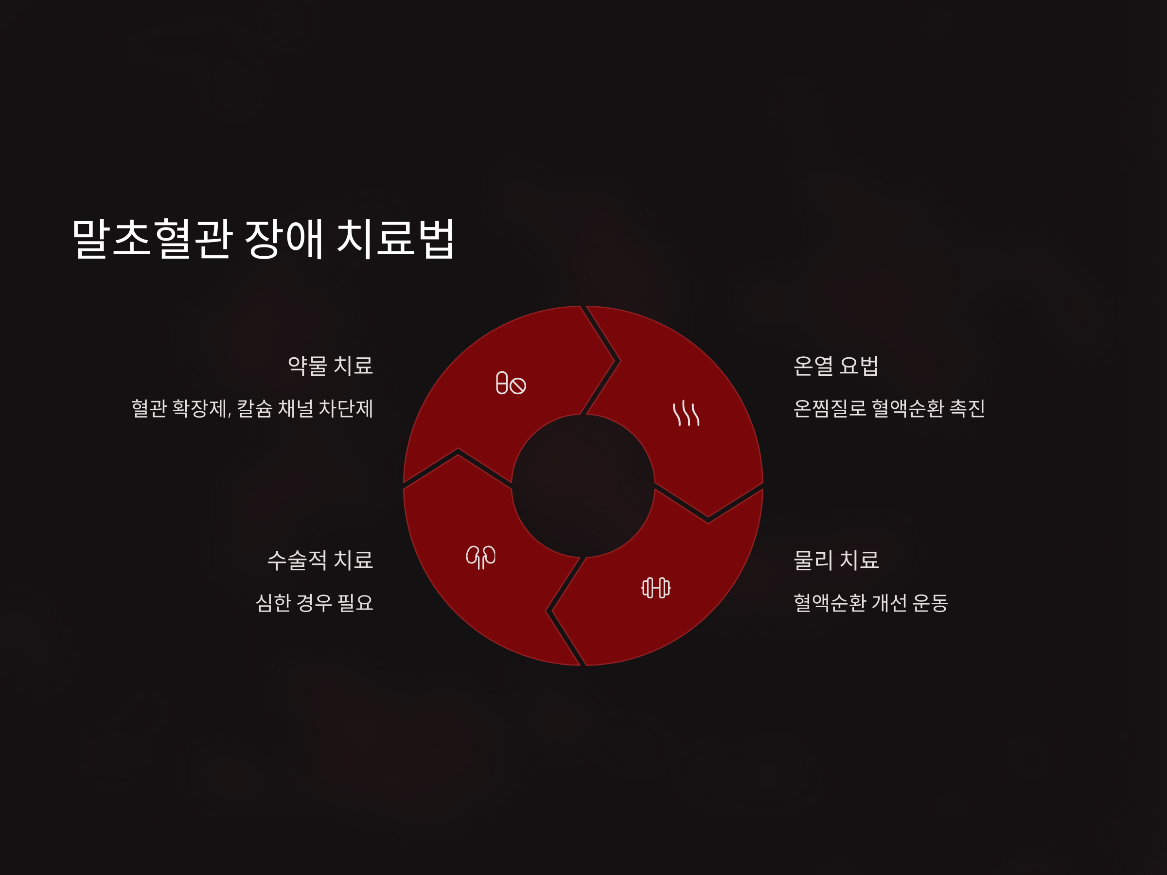 말초혈관 장애의 치료는 주로 혈액순환을 촉진하는 방향으로 이루어집니다. 혈관 확장제, 칼슘 채널 차단제 등의 약물이 사용되며, 증상이 심한 경우에는 수술적 치료가 필요할 수도 있습니다. 또한, 온찜질이나 물리치료를 통해 혈액순환을 개선할 수 있는 방법들이 권장됩니다.