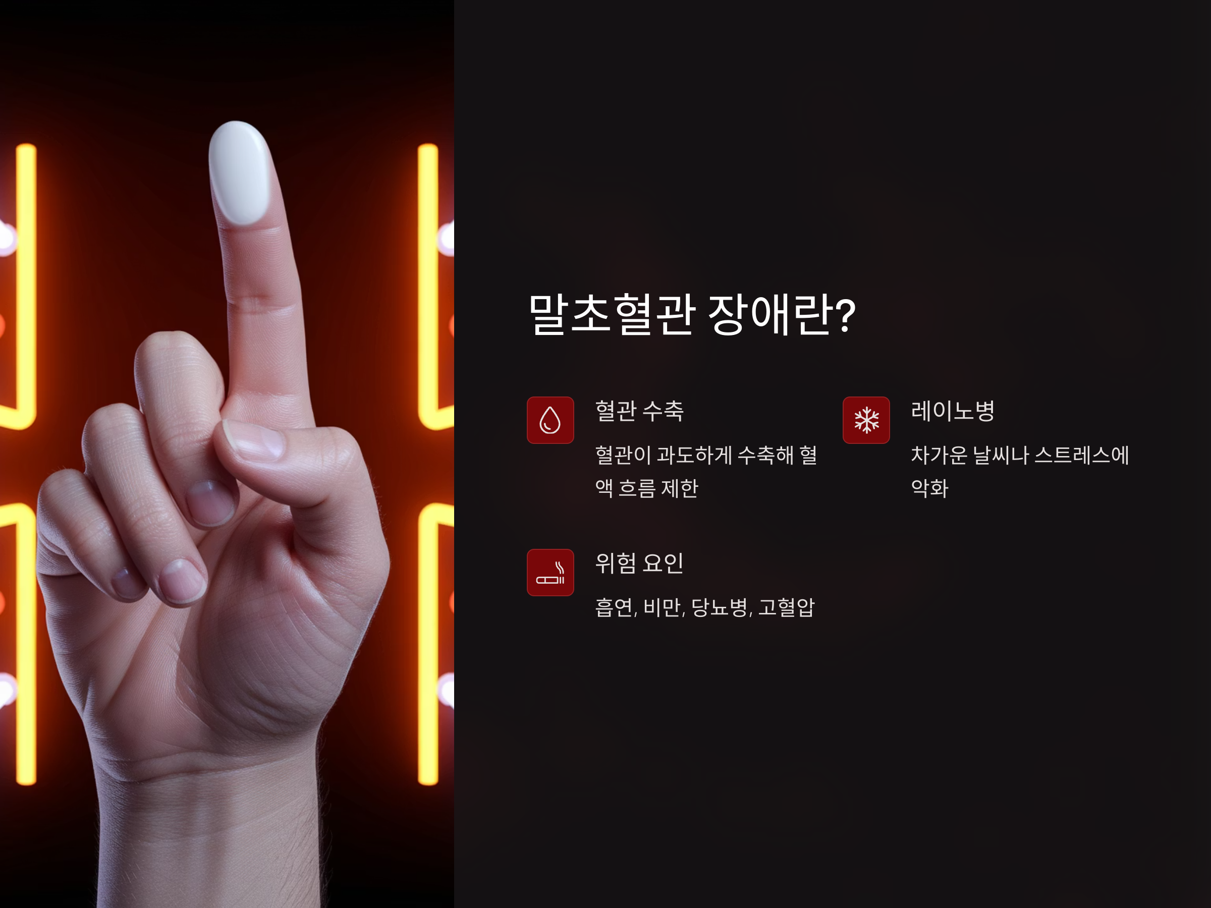 말초혈관 장애는 다양한 원인에 의해 발생할 수 있습니다. 가장 흔한 원인 중 하나는 레이노병이며, 그 외에도 당뇨병, 고혈압, 동맥경화 등의 만성 질환이 원인이 될 수 있습니다. 이 외에도 흡연이나 비만 등도 말초혈관에 부담을 주어 증상을 악화시킬 수 있습니다. 레이노병은 주로 여성이 많이 겪으며, 특정 환경에 노출되었을 때 증상이 더 악화되는 특징이 있습니다.
