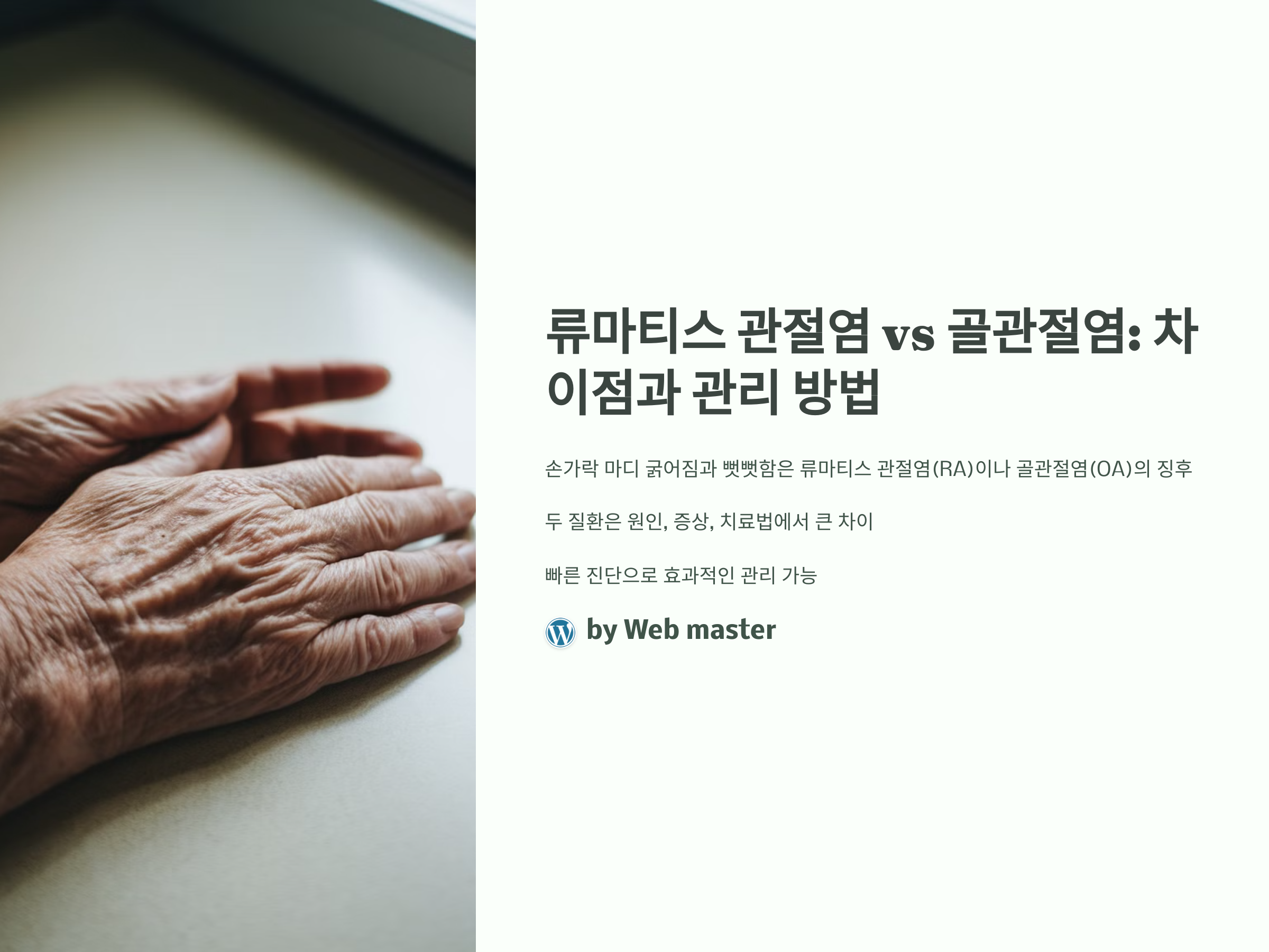 류마티스 관절염(RA)과 골관절염(OA)은 모두 손가락 마디의 굵어짐과 아침에 손이 뻣뻣해지는 증상을 유발할 수 있습니다. 하지만 두 질환은 원인, 증상, 치료 방법 등에서 큰 차이를 보입니다. 이 글에서는 류마티스 관절염과 골관절염의 차이를 비교하고, 각 질환에 대해 알아보겠습니다.