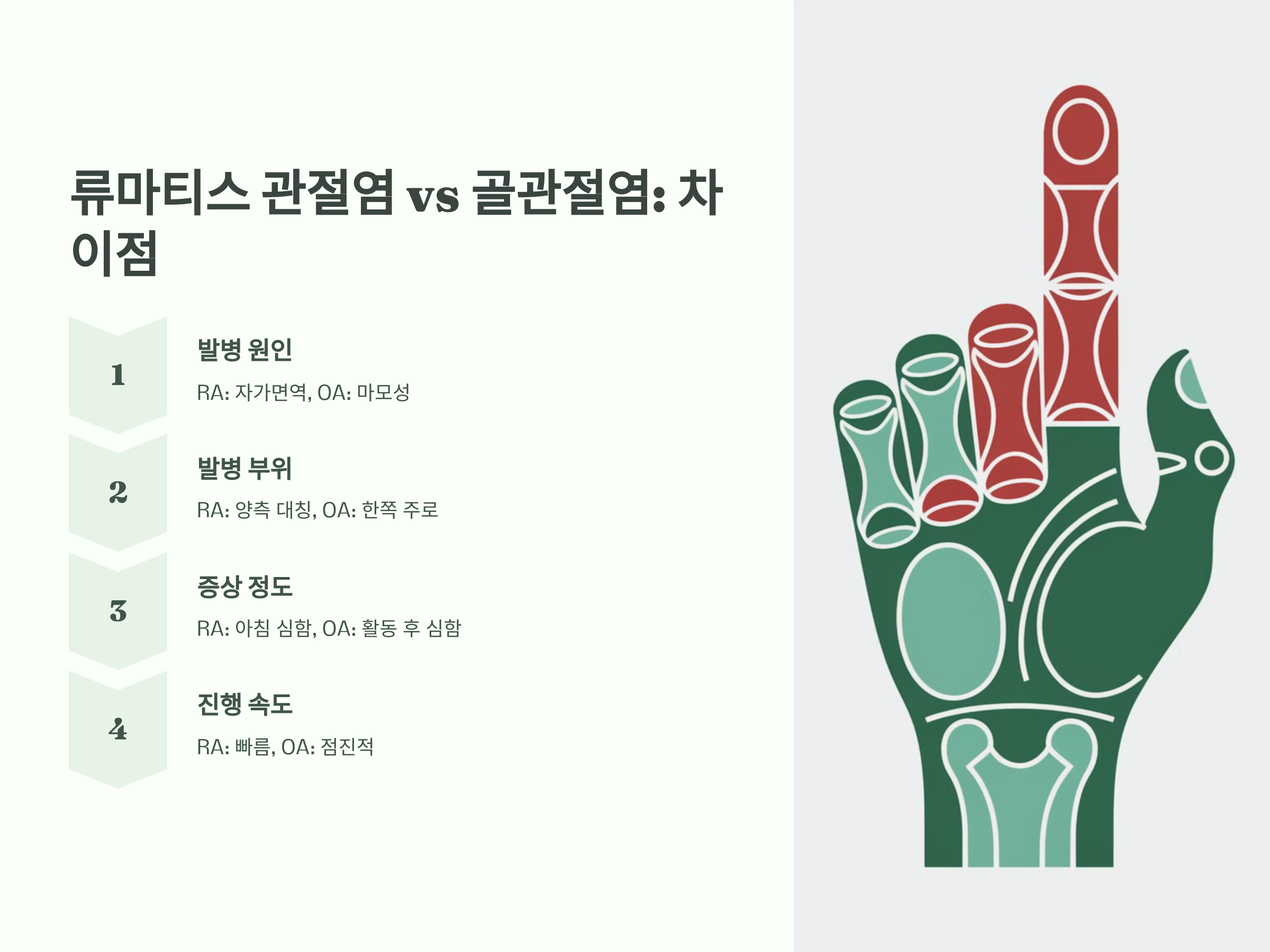 류마티스 관절염과 골관절염의 가장 큰 차이는 원인과 발병 패턴입니다. 류마티스 관절염은 자가면역 반응으로 발생하는 염증성 질환이며, 골관절염은 연골의 마모로 발생하는 퇴행성 질환입니다. 두 질환은 증상도 비슷하지만, 발병 부위와 진행 속도에서 차이를 보입니다.