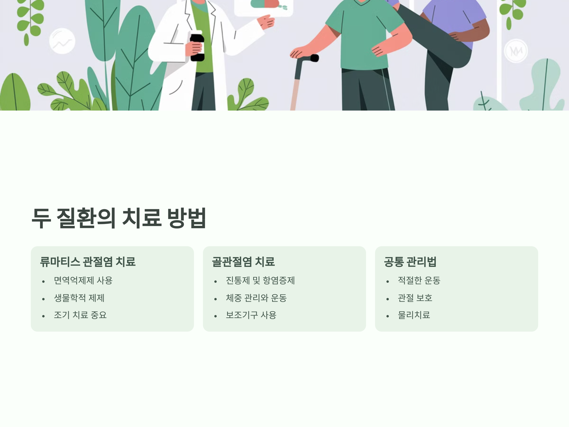 류마티스 관절염과 골관절염은 치료 방법도 다릅니다. 류마티스 관절염은 염증을 줄이는 것이 핵심이므로, 면역억제제나 생물학적 제제가 필요할 수 있습니다. 또한, 물리치료나 적절한 운동이 중요합니다. 반면, 골관절염은 관절의 연골이 마모되었기 때문에, 관절을 보호하는 방법이나, 체중 관리가 중요합니다.