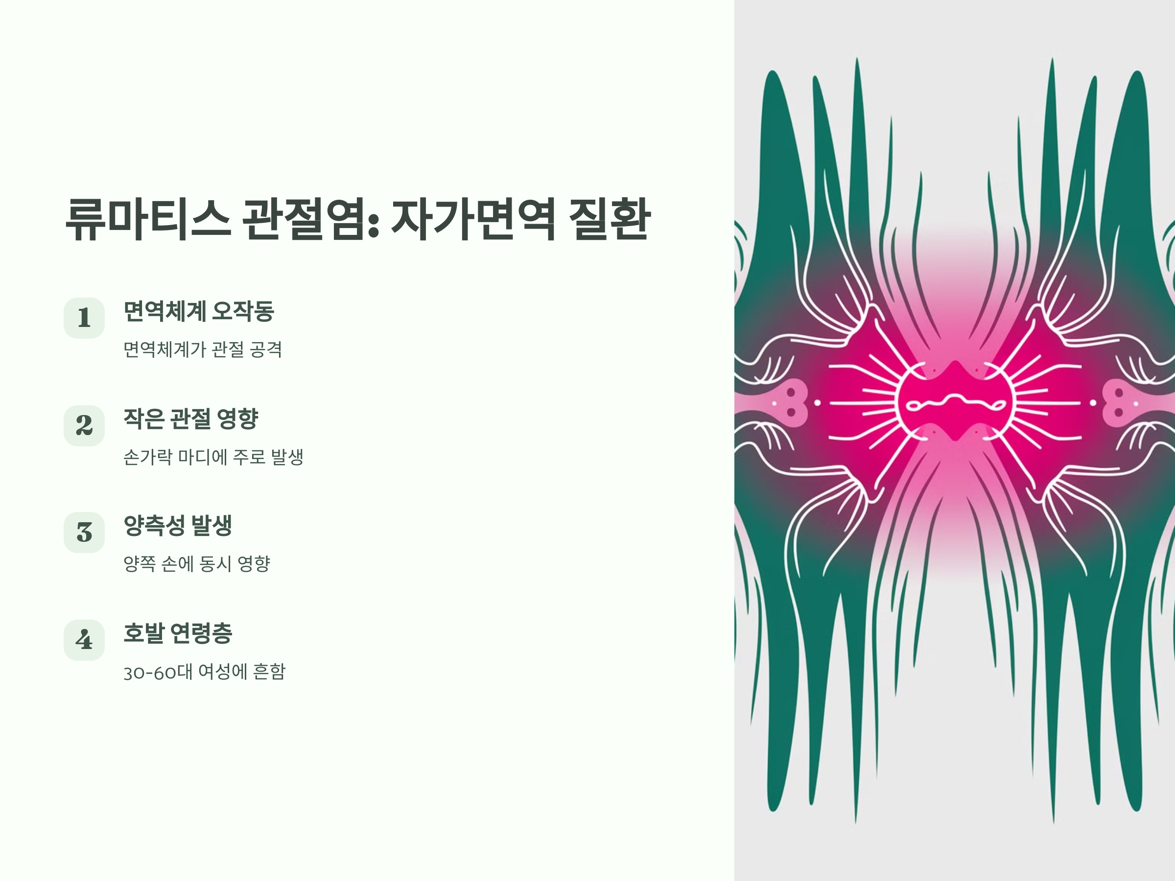 류마티스 관절염은 자가면역 질환으로, 면역 체계가 본래는 자기 자신을 공격하지 않아야 하는데, 몸의 관절을 공격하는 형태로 나타납니다. 손가락 마디와 같은 작은 관절에서 주로 발생하며, 이로 인해 마디가 붓고 통증을 유발합니다. 류마티스 관절염은 대개 양쪽 손에 동시에 영향을 미치며, 아침에 특히 뻣뻣하고 움직임에 제한을 느낄 수 있습니다. 이 질환은 주로 30대에서 60대 사이의 여성에게 더 많이 발생합니다.