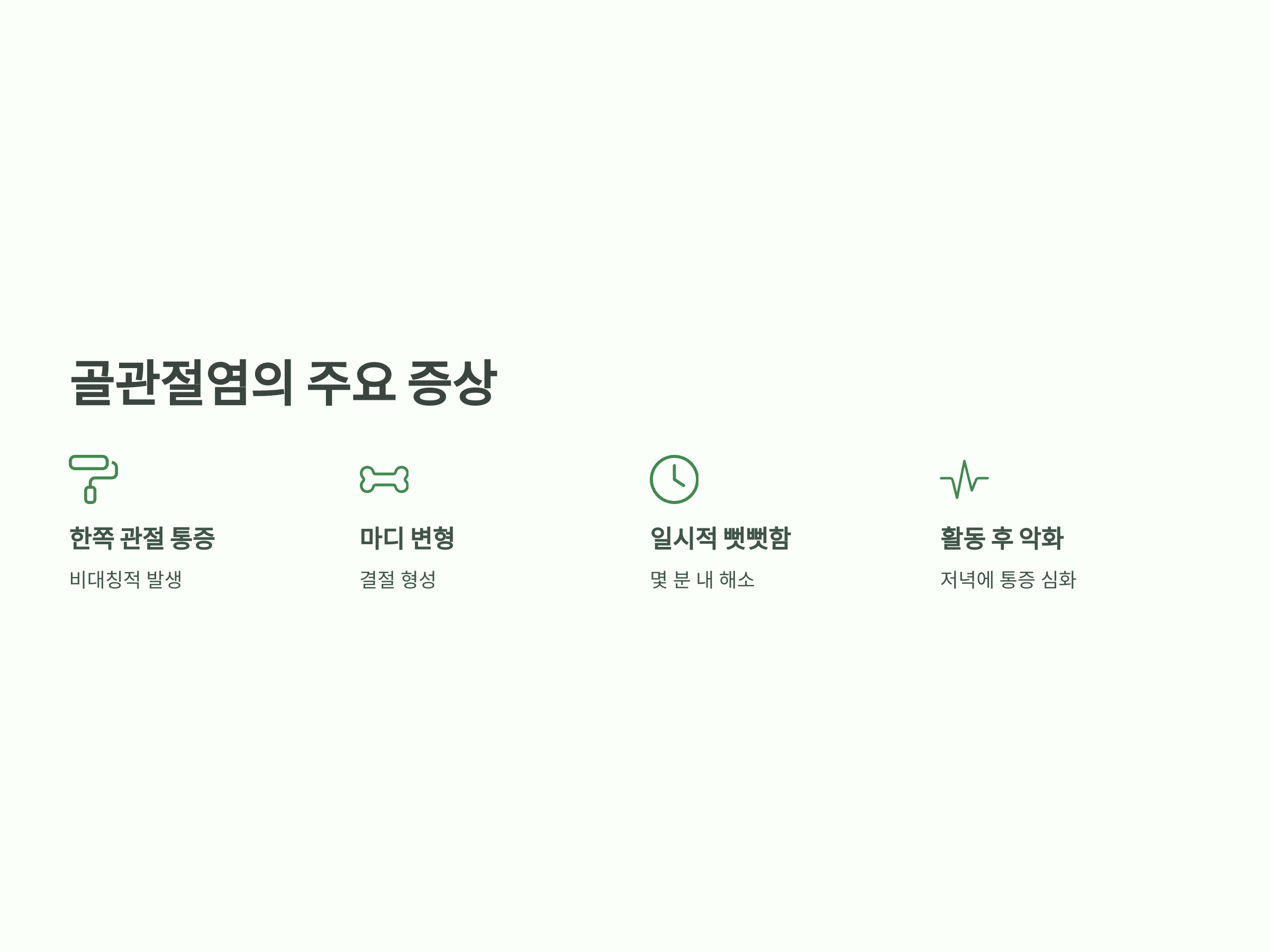 - 저녁의 통증: 활동 후 통증이 심해진다면 골관절염일 가능성이 높습니다.