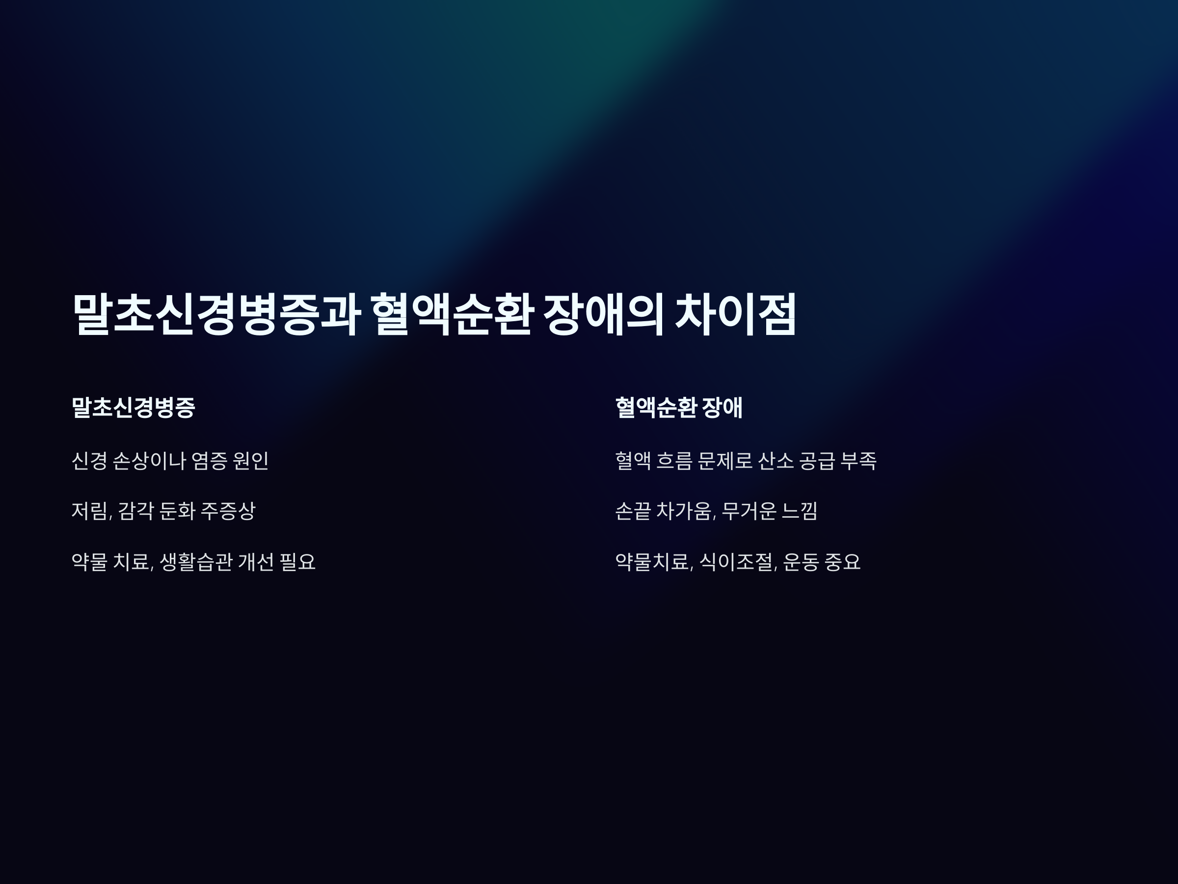 말초신경병증의 경우, 신경의 손상으로 인한 감각의 둔화나 저린 느낌이 주로 나타나며, 더 심각한 경우에는 운동 기능의 저하도 발생할 수 있습니다. 혈액순환 장애와는 달리, 말초신경병증은 신경 자체에 문제가 생긴 것이기 때문에, 감각의 변화가 주된 증상입니다.