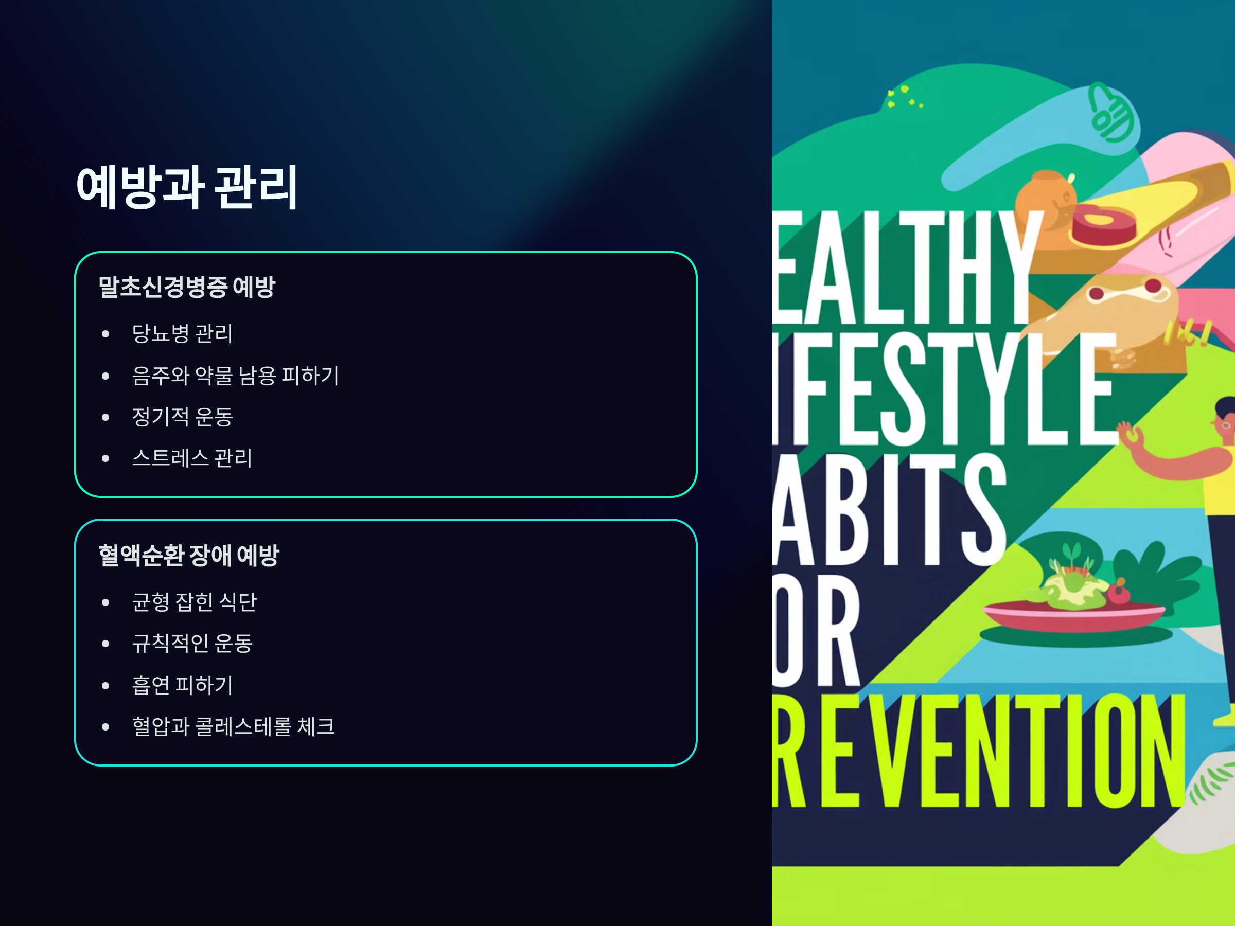 두 질환 모두 예방이 중요한데, 생활 습관 개선이 가장 큰 역할을 합니다. 말초신경병증을 예방하기 위해서는 당뇨병 관리, 음주와 약물 남용을 피하는 것이 중요합니다. 또한, 정기적인 운동을 통해 신경 건강을 유지하고, 스트레스 관리도 중요합니다.