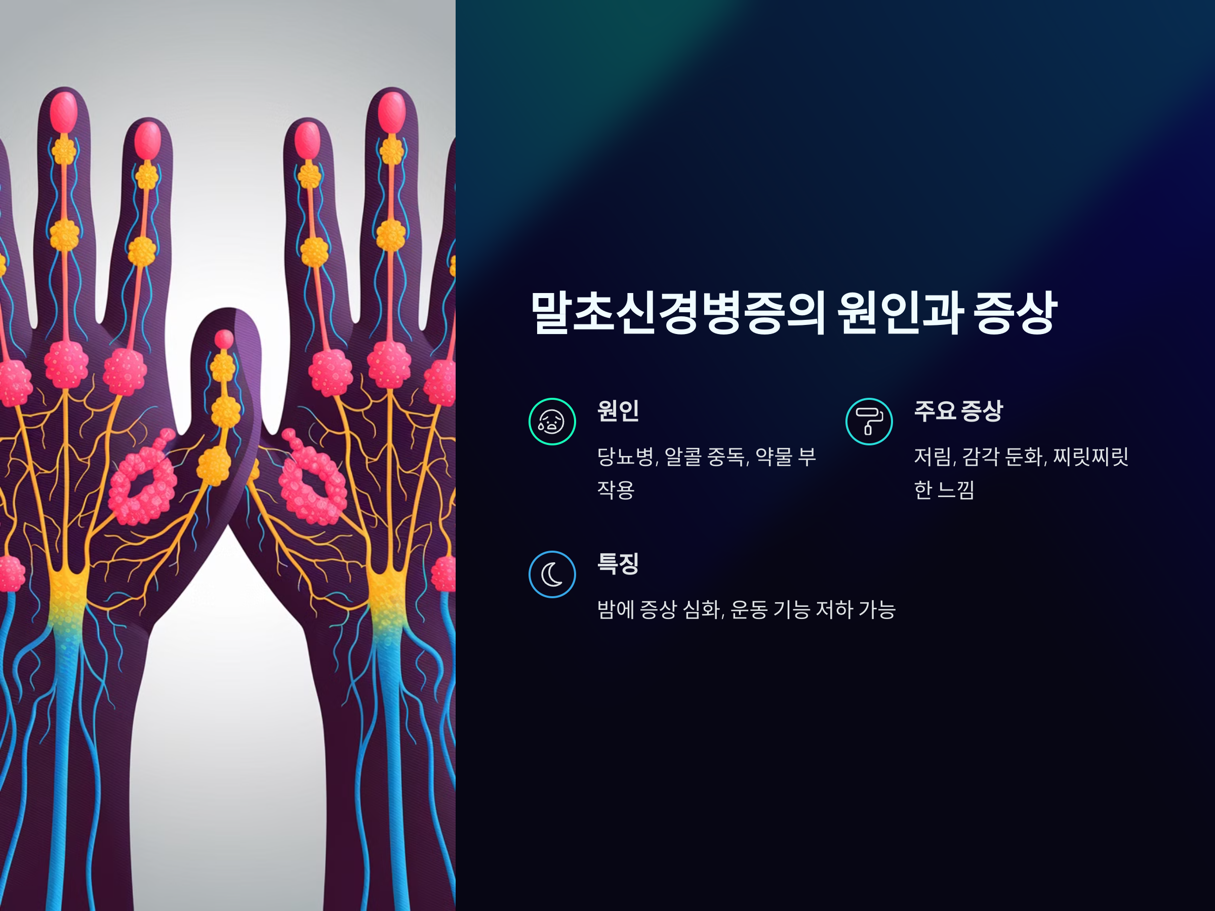 - 말초신경병증은 신경의 손상이나 염증에 의해 발생하는 질환으로, 신경 기능의 이상이 주된 원인입니다. 손끝의 저림이나 감각 둔화가 주된 증상이며, 치료는 원인에 따라 약물 치료나 생활습관 개선 등이 필요합니다.