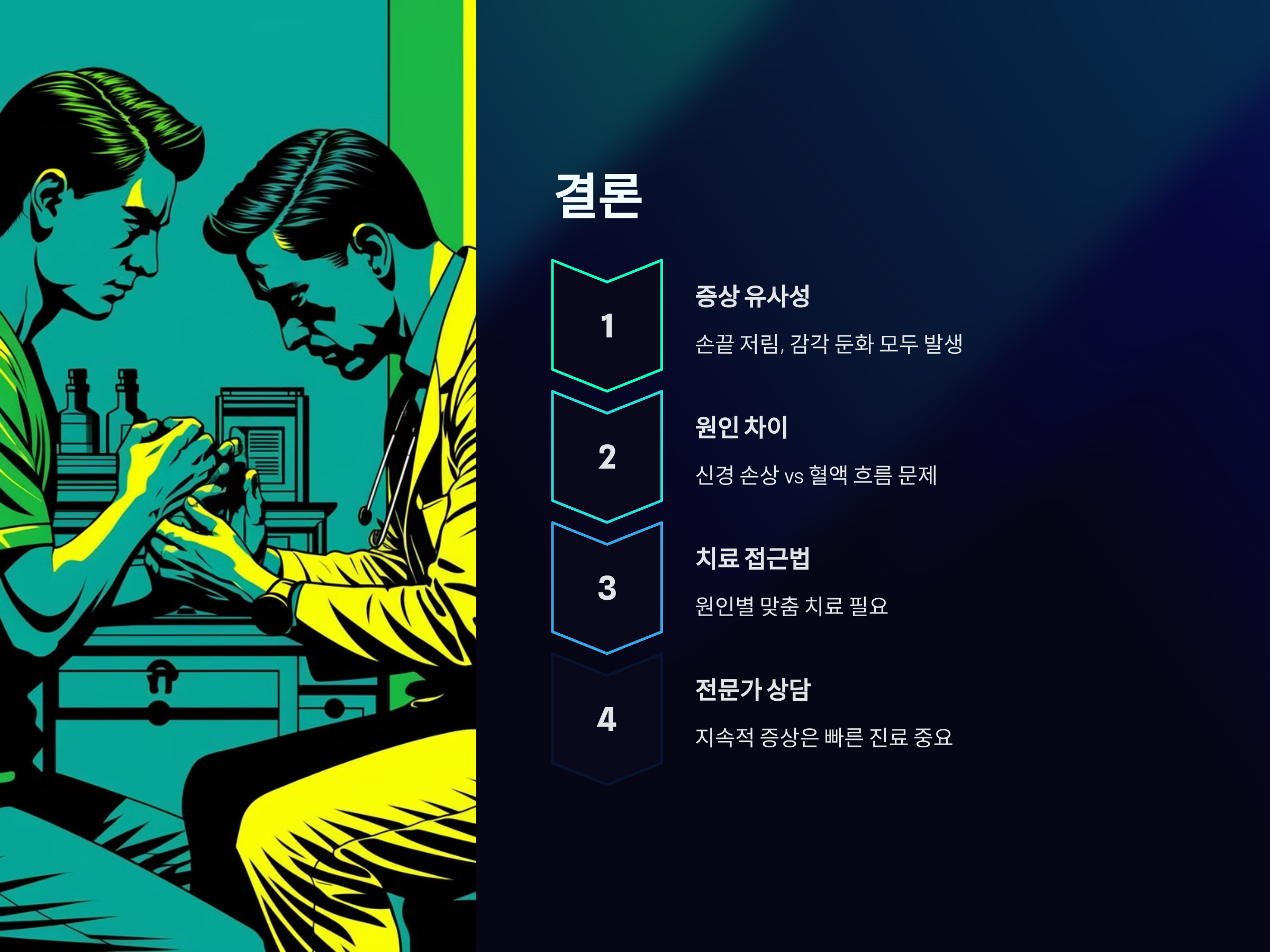 손끝이 저리고 감각이 둔한 증상은 말초신경병증과 혈액순환 장애 모두에서 나타날 수 있지만, 그 원인과 치료 방법은 다릅니다. 만약 손끝의 저림이나 감각 둔화가 지속된다면, 빠른 시일 내에 전문가의 진료를 받는 것이 중요합니다. 각각의 원인에 맞는 치료를 통해 증상을 효과적으로 관리하고 예방할 수 있습니다.