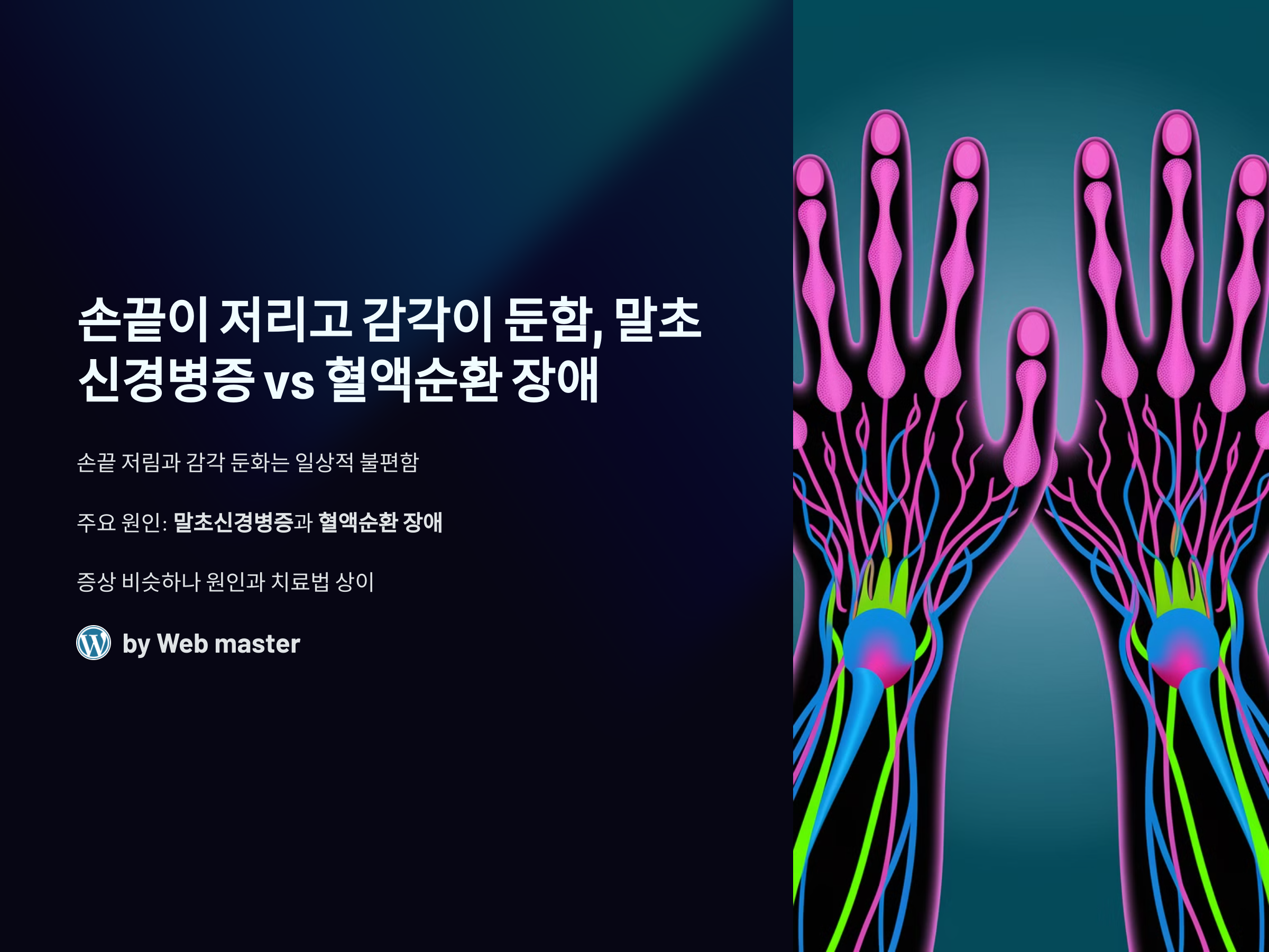손끝이 저리고 감각이 둔한 증상은 우리가 일상에서 자주 경험할 수 있는 불편함입니다. 그러나 이러한 증상은 다양한 원인으로 발생할 수 있으며, 그 중 가장 흔하게 의심되는 두 가지 원인은 말초신경병증과 혈액순환 장애입니다. 이 두 가지 질환은 증상이 비슷하게 나타날 수 있지만, 그 원인과 치료법은 상당히 다릅니다. 그렇다면 손끝이 저리고 감각이 둔한 원인이 말초신경병증일지 혈액순환 장애일지를 어떻게 구분할 수 있을까요? 이번 글에서는 말초신경병증과 혈액순환 장애의 차이점을 자세히 알아보겠습니다.