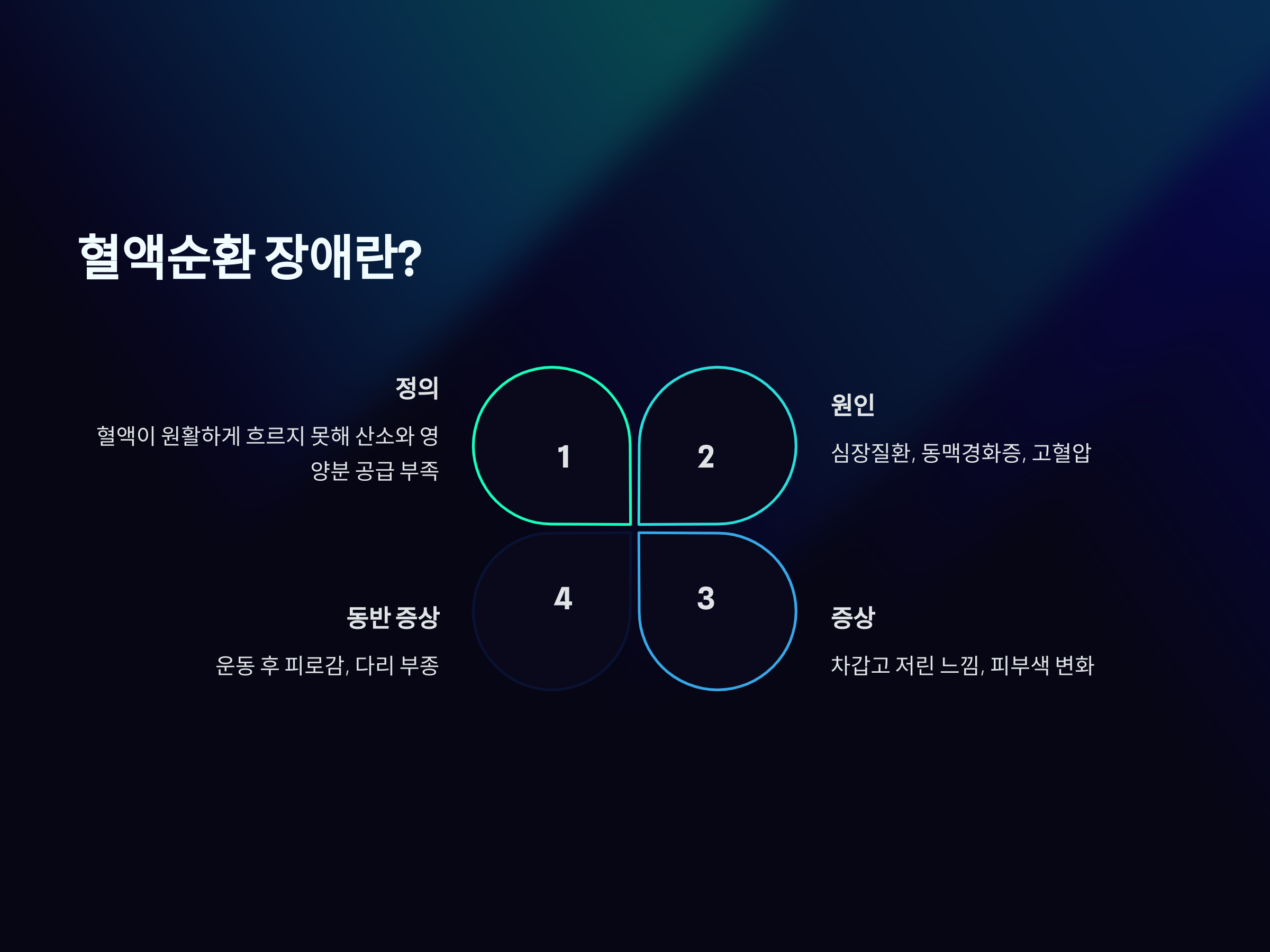 혈액순환 장애는 혈액이 원활하게 흐르지 못해 신체의 각 부위에 충분한 산소와 영양분이 공급되지 않는 상태를 말합니다. 특히 심장질환, 동맥경화증, 고혈압 등과 같은 질환들이 혈액순환 장애를 유발할 수 있습니다. 혈액순환 장애가 발생하면, 손끝이나 발끝 등 말초 부위에 차갑고 저린 느낌을 주거나, 피부색 변화가 일어날 수 있습니다.