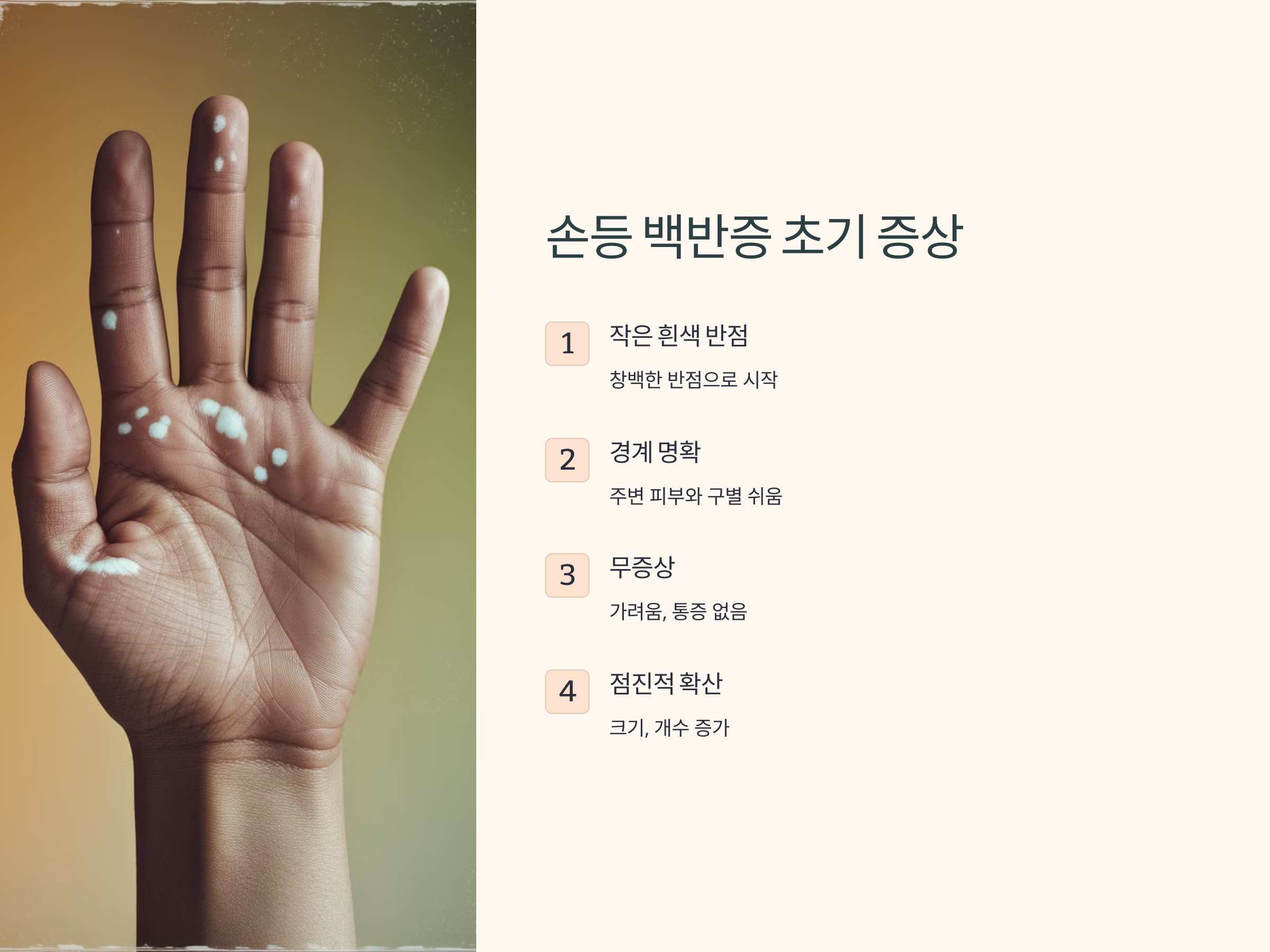 손등에 나타나는 백반증의 초기 증상은 다음과 같습니다: