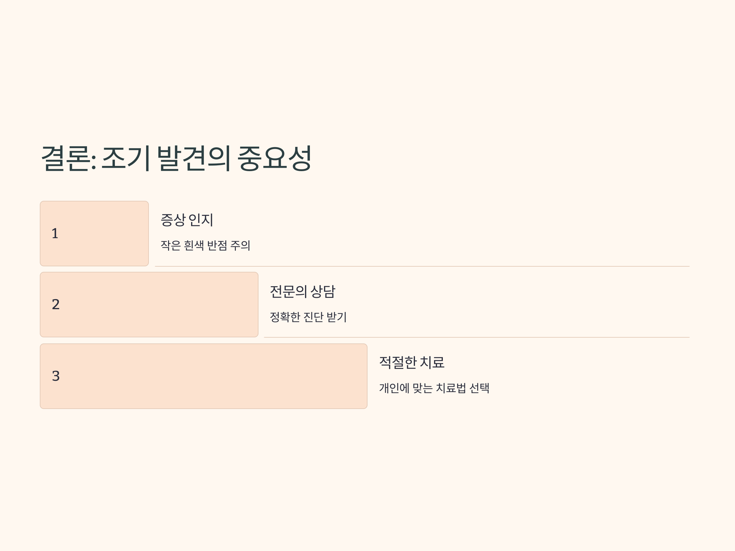 - 초기 단계: 작은 흰색 반점이 나타나며, 경계가 명확하고 자각 증상이 없습니다.