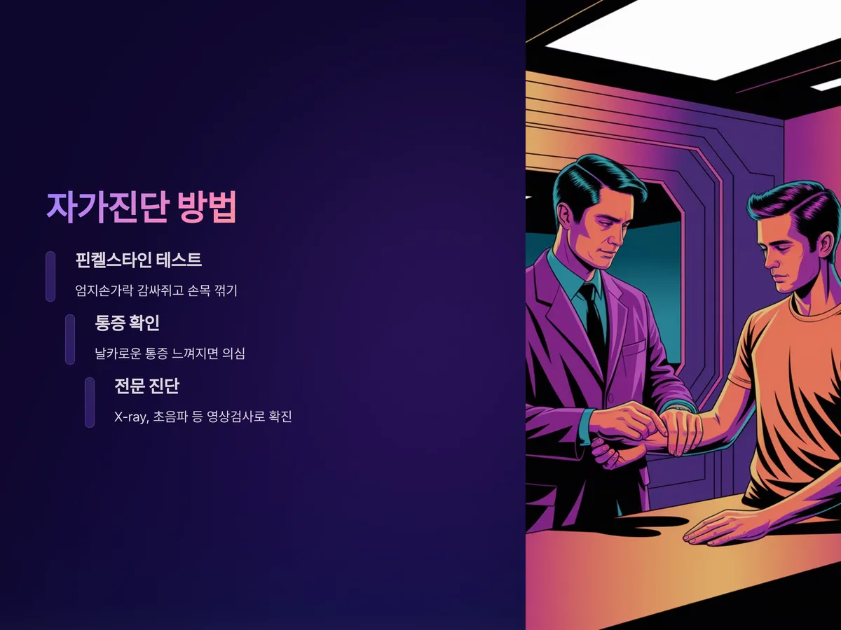 가장 널리 알려진 자가진단법은 '핀켈스타인 테스트(Finkelstein Test)'입니다. 이 방법은 엄지손가락을 감싸쥐고 손목을 새끼손가락 방향으로 꺾는 방식으로, 이때 날카로운 통증이 느껴진다면 건초염일 가능성이 큽니다.