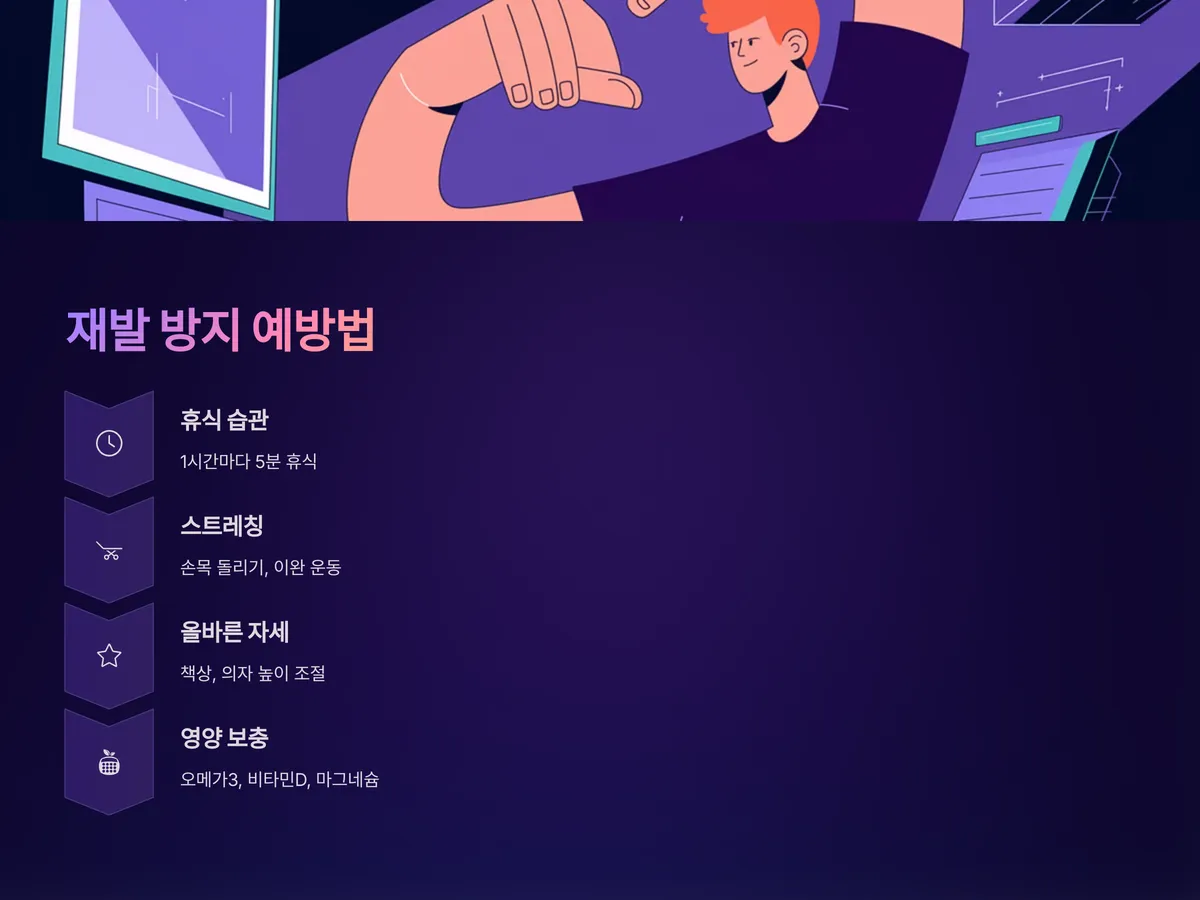 - 장시간 반복 동작 피하기: 스마트폰 사용, 키보드 타이핑 등은 1시간마다 5분 정도 쉬는 습관이 필요합니다.