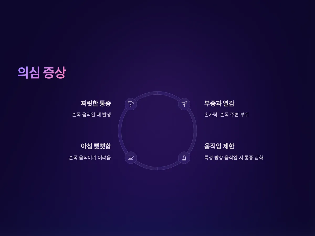 이 중 2가지 이상에 해당된다면 손목 건초염을 의심해볼 필요가 있습니다. 특히 통증이 하루 이상 지속되거나 점점 강해지는 경우엔 더더욱 병원을 방문해 정확한 진단을 받는 것이 중요합니다. 단순한 근육통이나 일시적인 염좌와 다르게, 손목 건초염은 힘줄의 구조적인 문제와 염증이 복합적으로 작용하기 때문에 전문적인 치료가 필요합니다.
