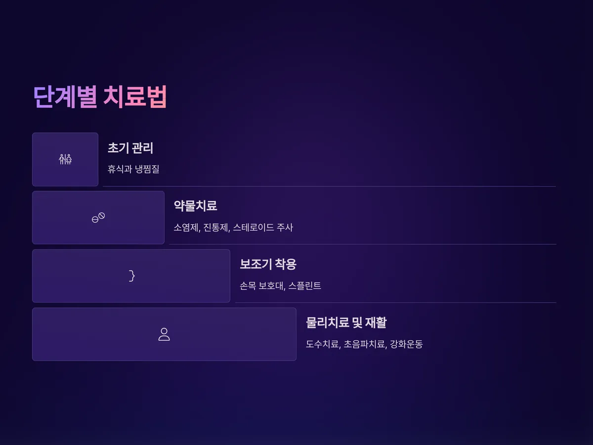 2단계: 약물치료 – 소염제, 진통제, 국소 연고 등을 통해 염증 완화와 통증을 억제합니다. 특히 스테로이드 주사요법은 단기간에 효과가 탁월하지만, 반복 사용은 삼가는 것이 좋습니다.