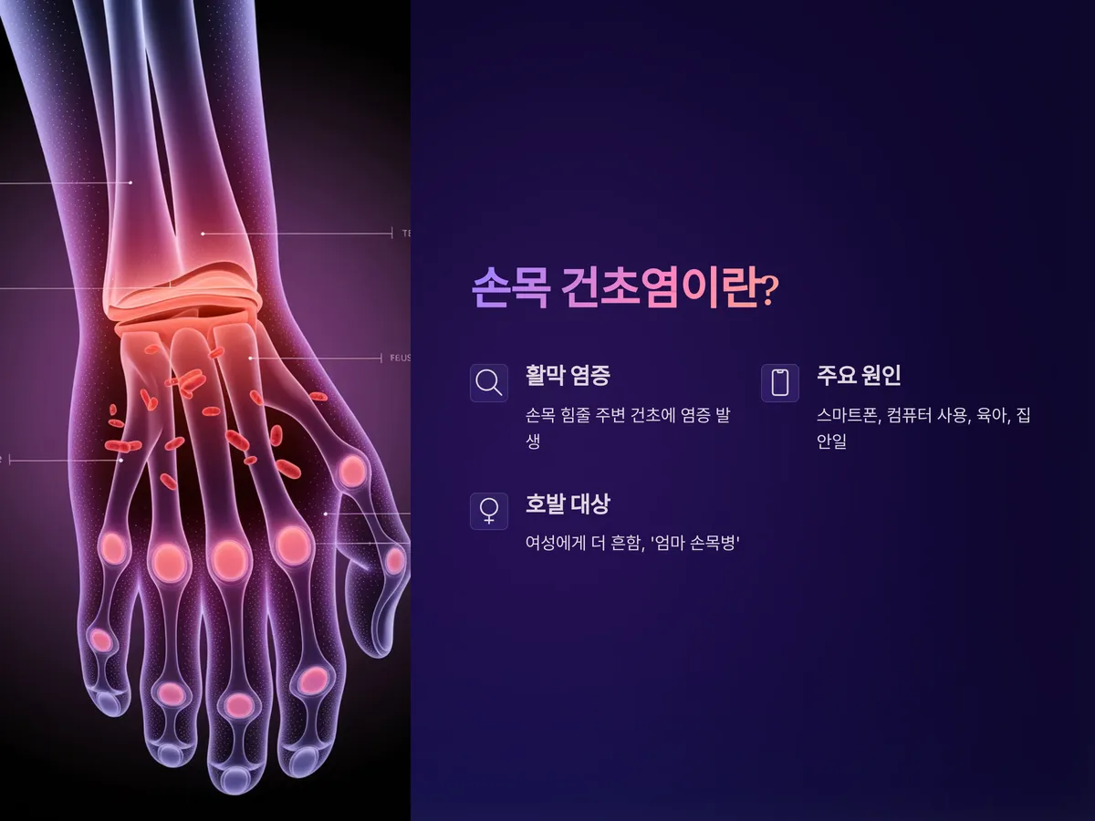 손목 건초염은 손목의 힘줄을 둘러싼 활막(건초)에 염증이 생겨 발생하는 질환입니다. 주로 엄지손가락 쪽에 집중되는 통증이 특징이며, 반복적인 손목 사용이나 무리한 움직임이 주요 원인입니다. 특히 스마트폰 과다 사용, 컴퓨터 마우스 작업, 육아와 집안일, 요리 등 손목을 많이 사용하는 일상에서 쉽게 발병할 수 있습니다.