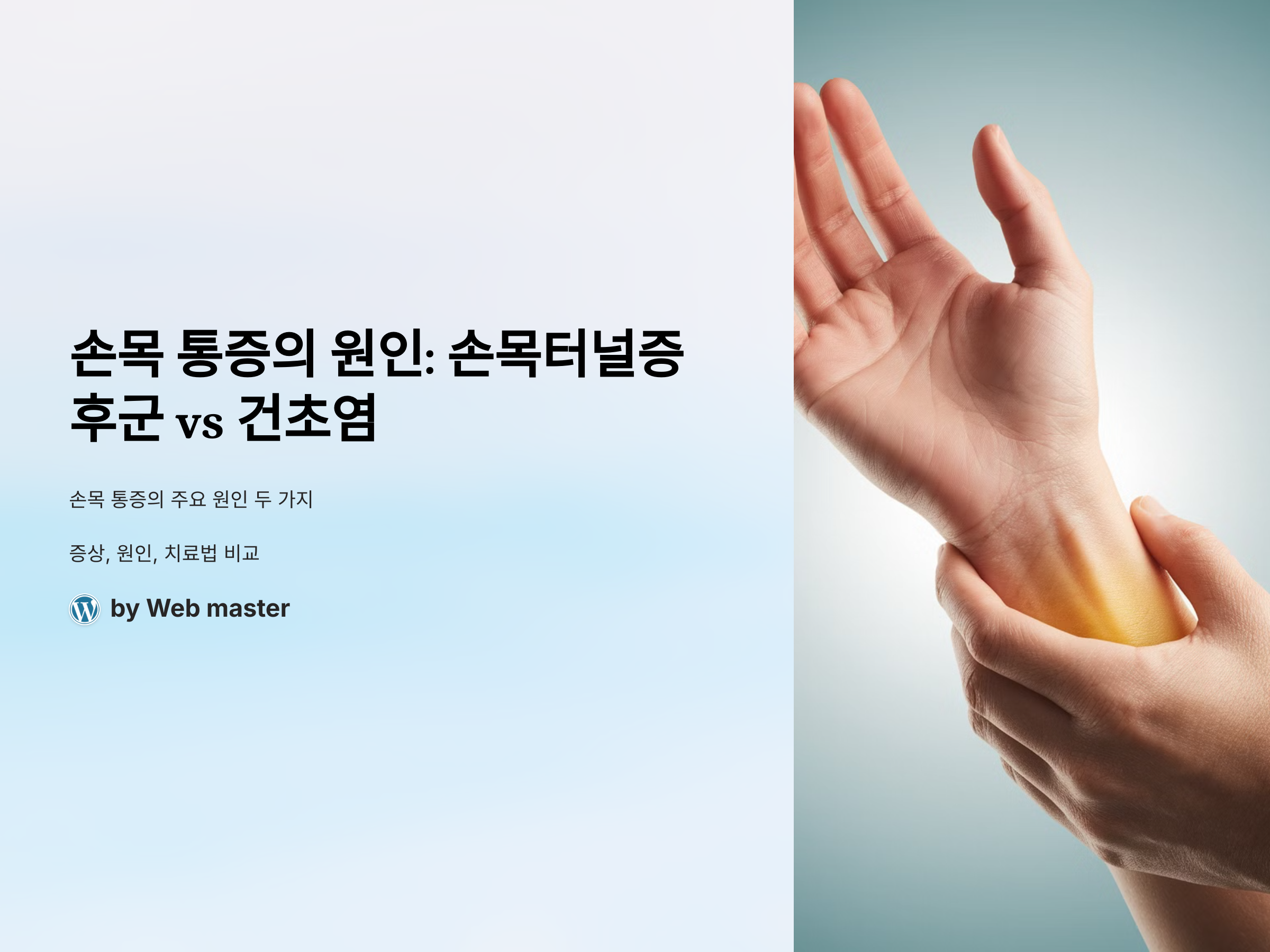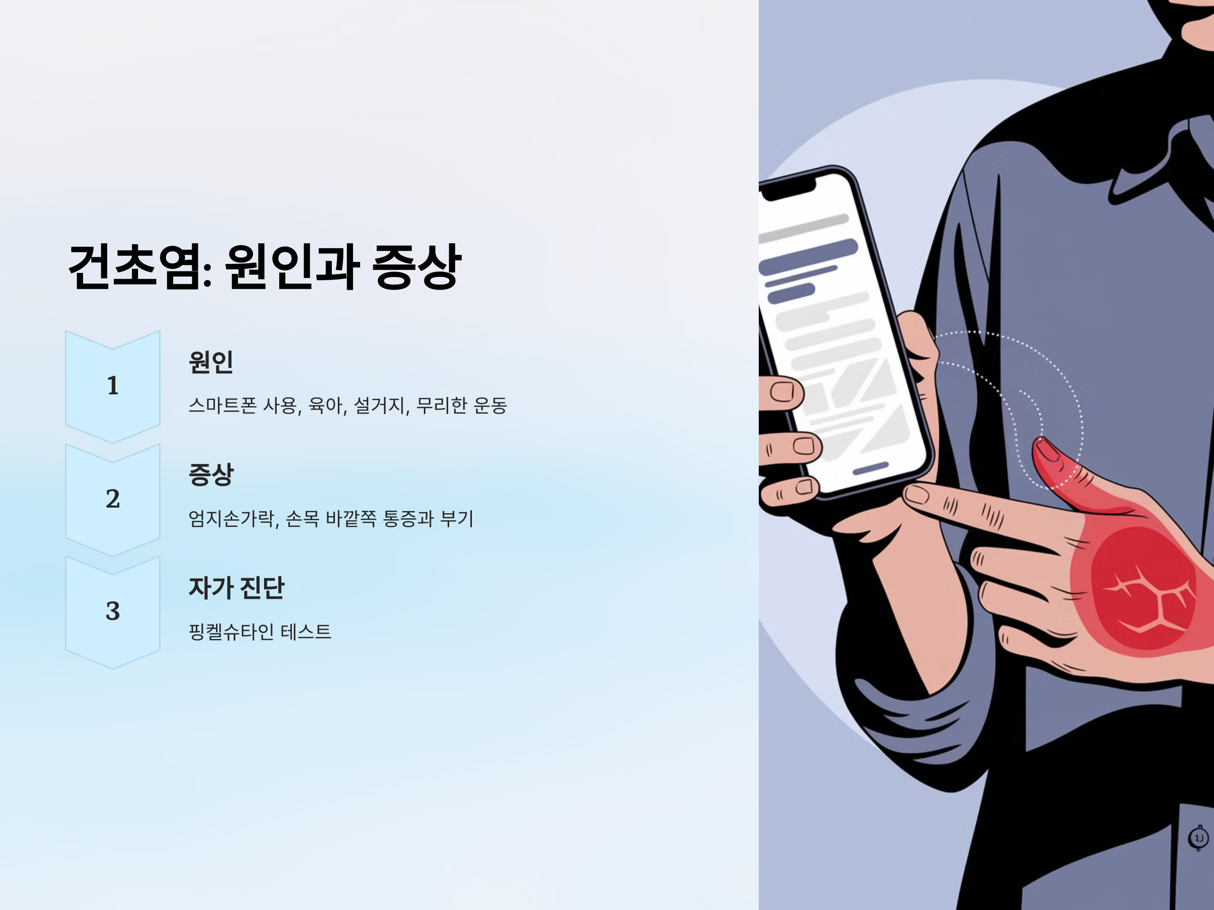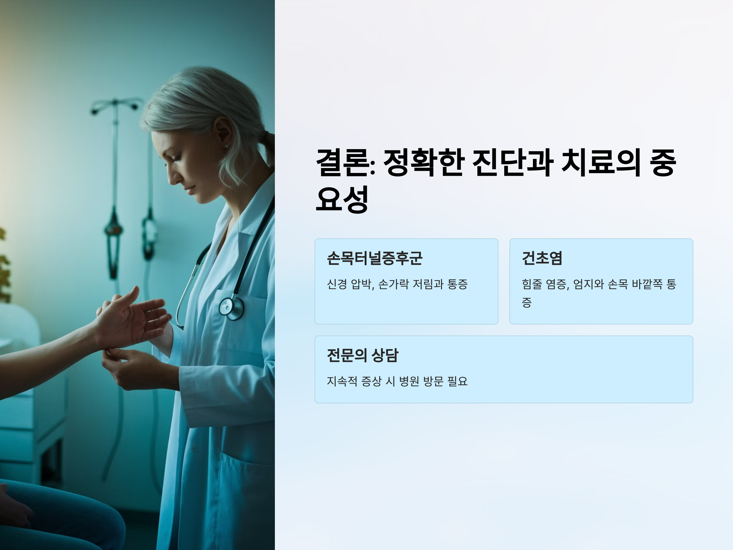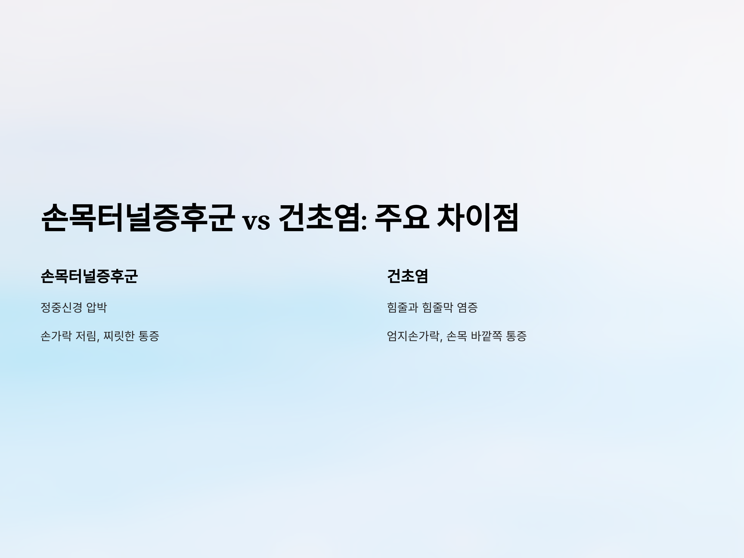 | 악화 요인 | 컴퓨터 사용, 스마트폰 사용, 손목 구부리기 | 손목 돌리기, 엄지손가락을 반복적으로 사용 |
