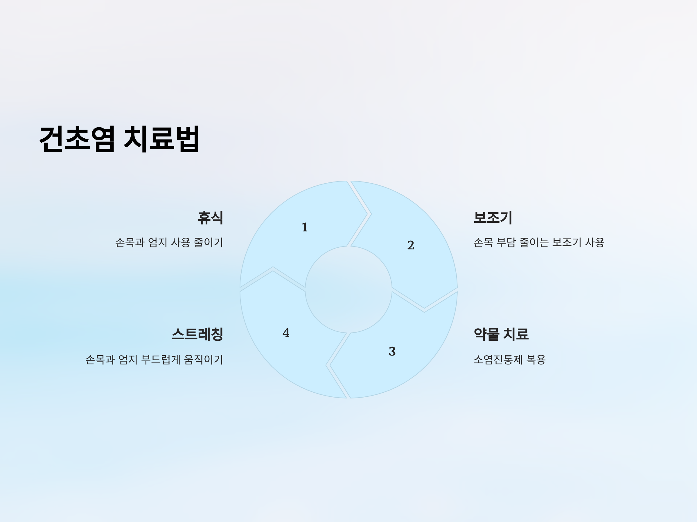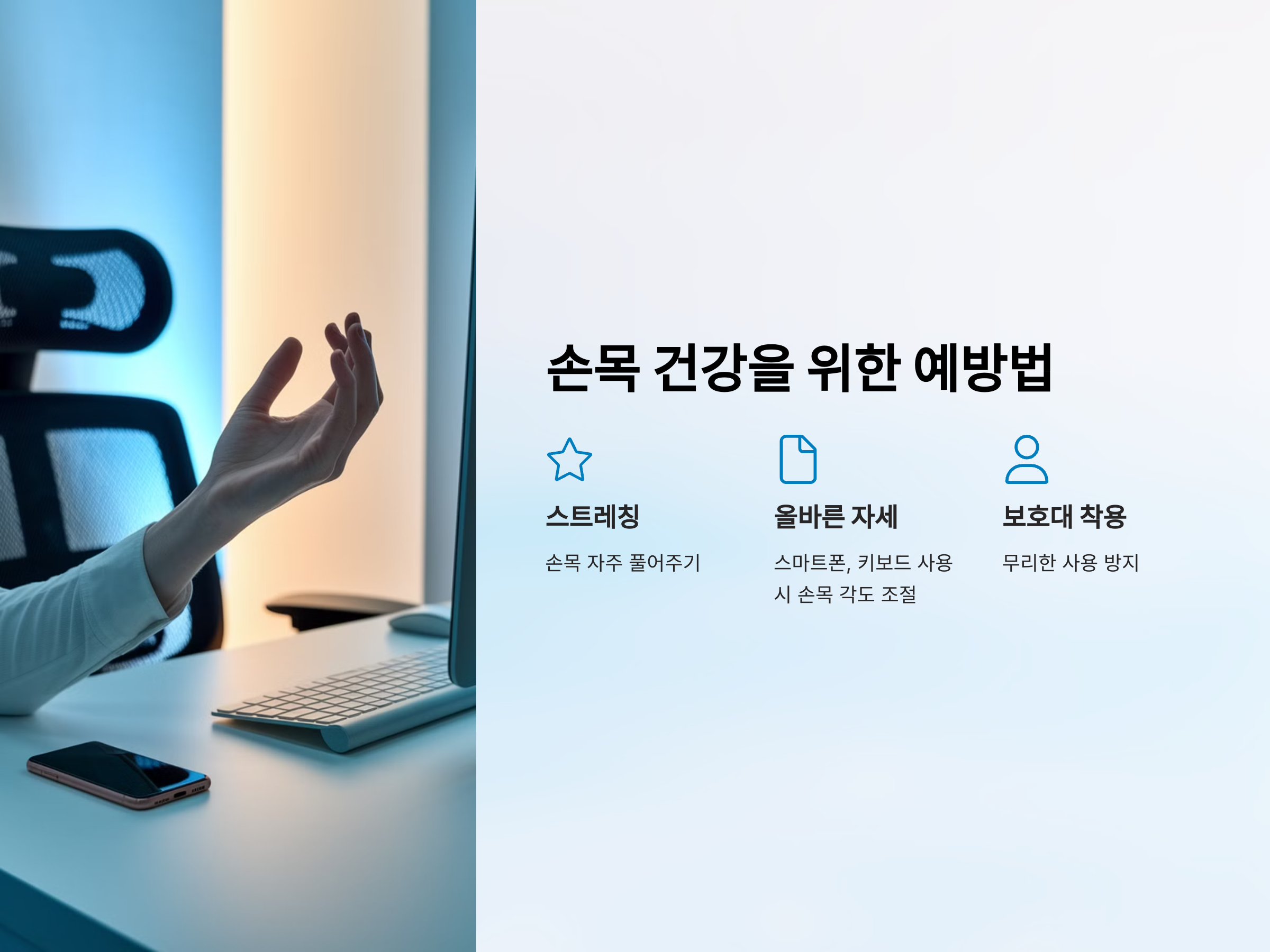 - 올바른 자세 유지: 스마트폰, 키보드 사용 시 손목 각도 조절