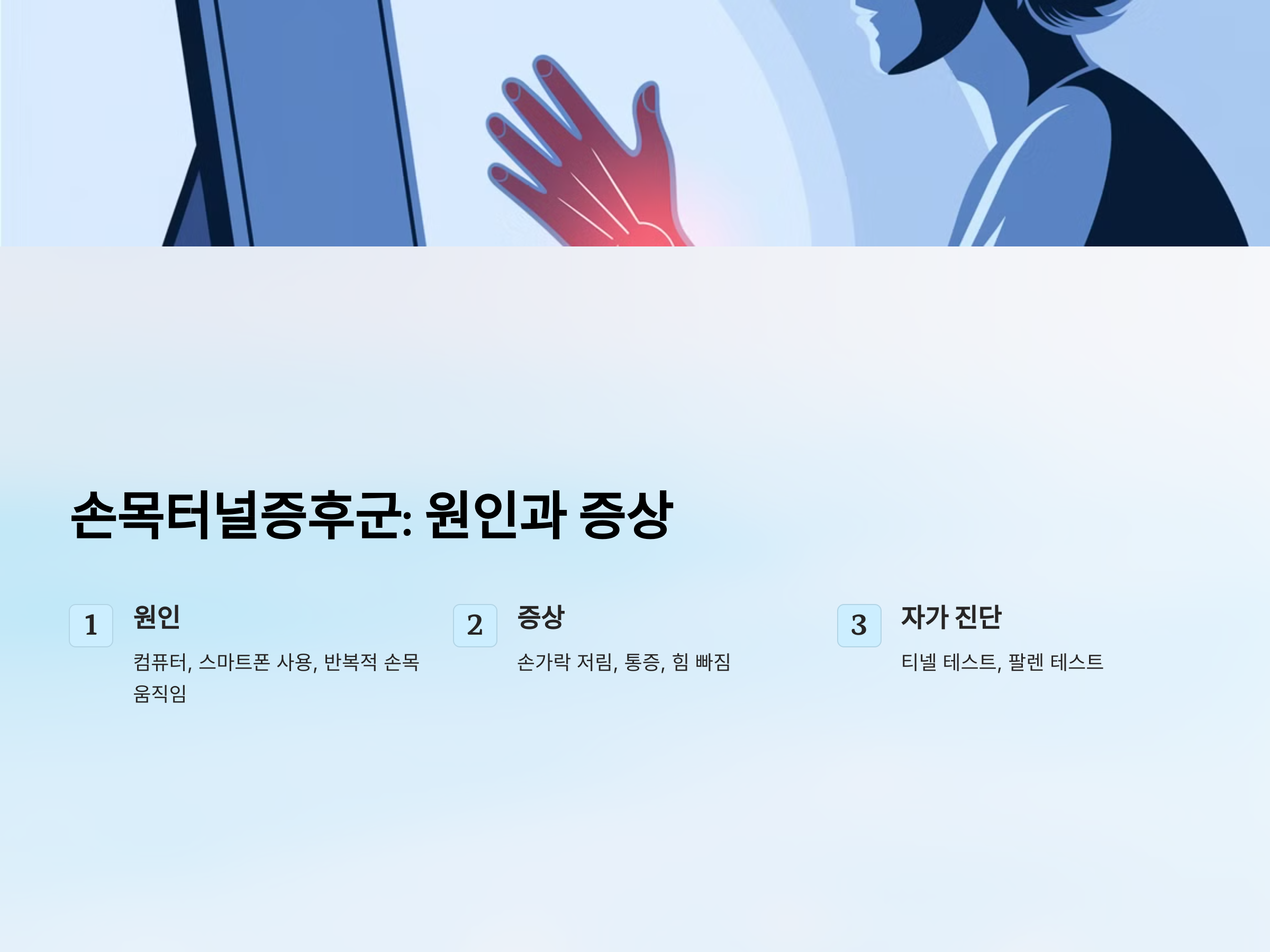 - 손목터널증후군은 신경 압박이 원인으로, 손가락 저림과 찌릿한 통증이 특징입니다.