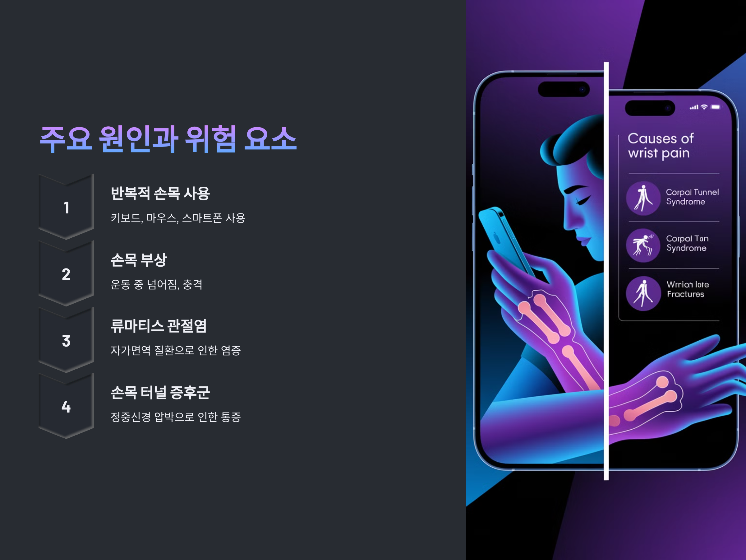 위와 같은 위험 요소를 줄이기 위해서는 손목 사용 습관을 개선하고, 필요할 경우 보조기구를 활용하는 것이 중요합니다.