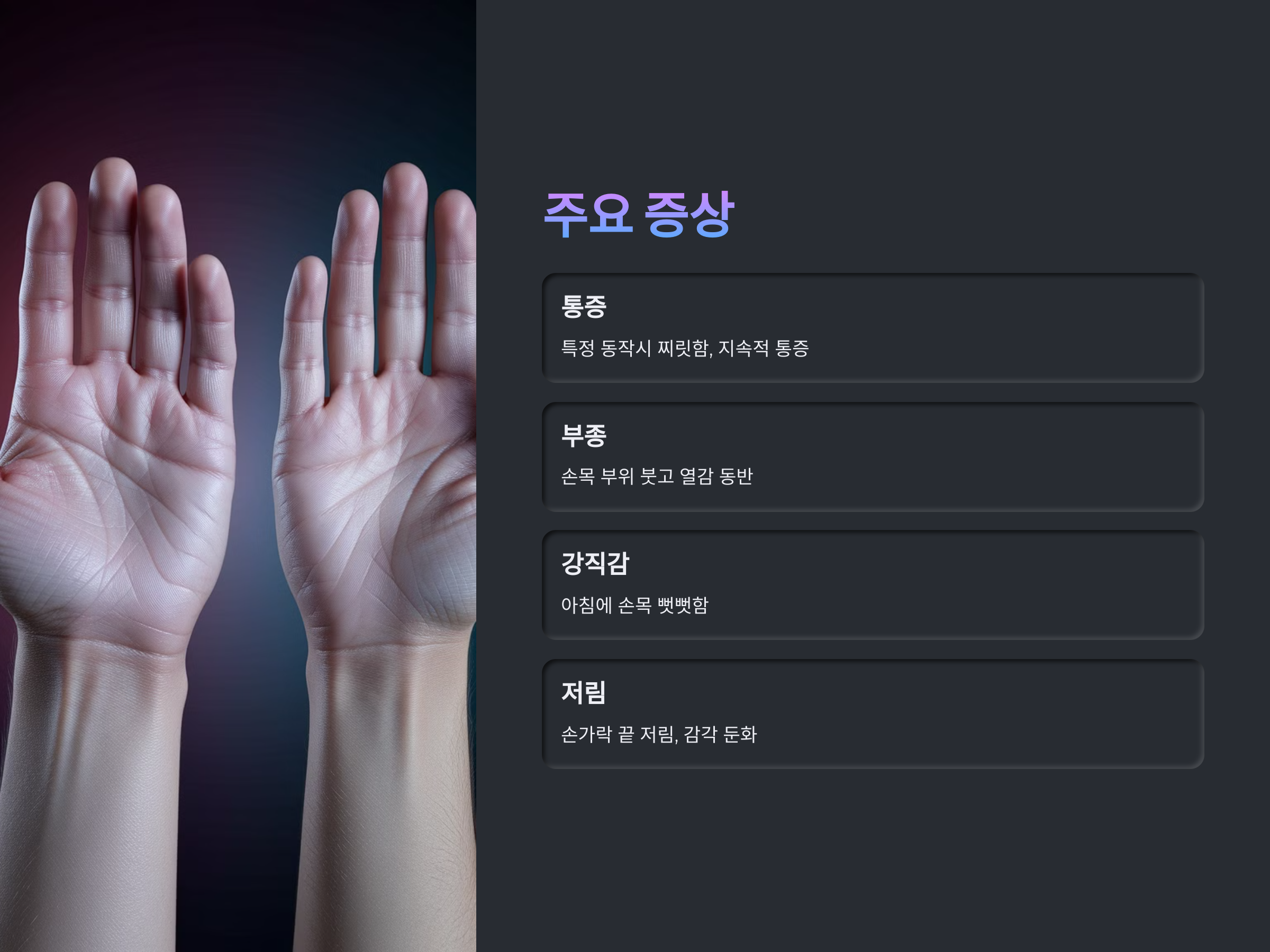 이러한 증상이 지속된다면 단순한 손목 피로가 아니라 질환일 가능성이 높기 때문에 빠른 진단과 치료가 필요합니다.