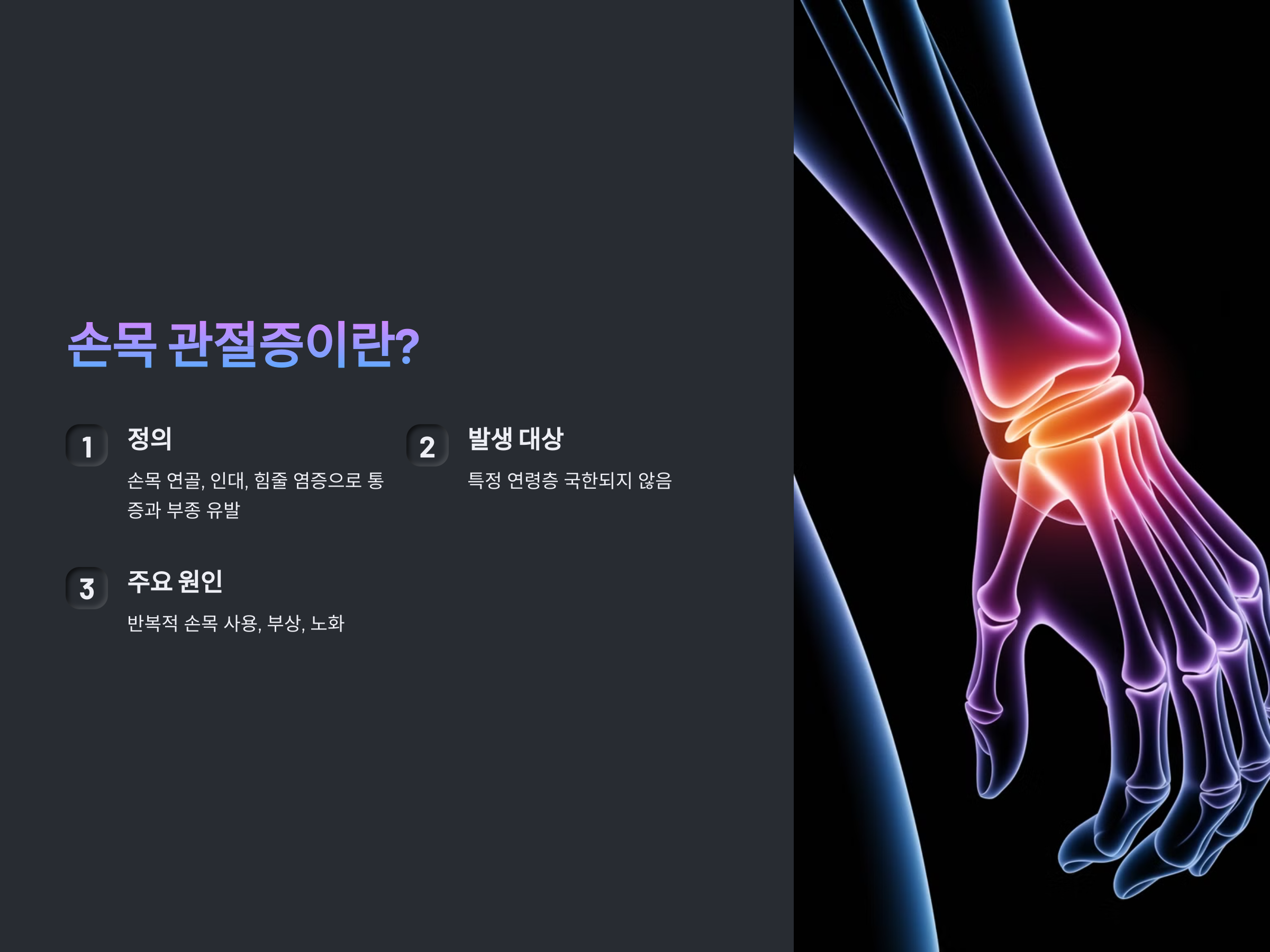 손목 관절증은 손목의 연골이나 인대, 힘줄 등에 염증이 발생하면서 통증과 부종을 유발하는 질환입니다. 이 질환은 특정 연령층에 국한되지 않고, 스마트폰 사용이 많은 젊은 층에서도 빈번하게 발생하고 있습니다. 대표적인 원인으로는 반복적인 손목 사용, 부상, 노화로 인한 관절 변화 등이 있습니다.