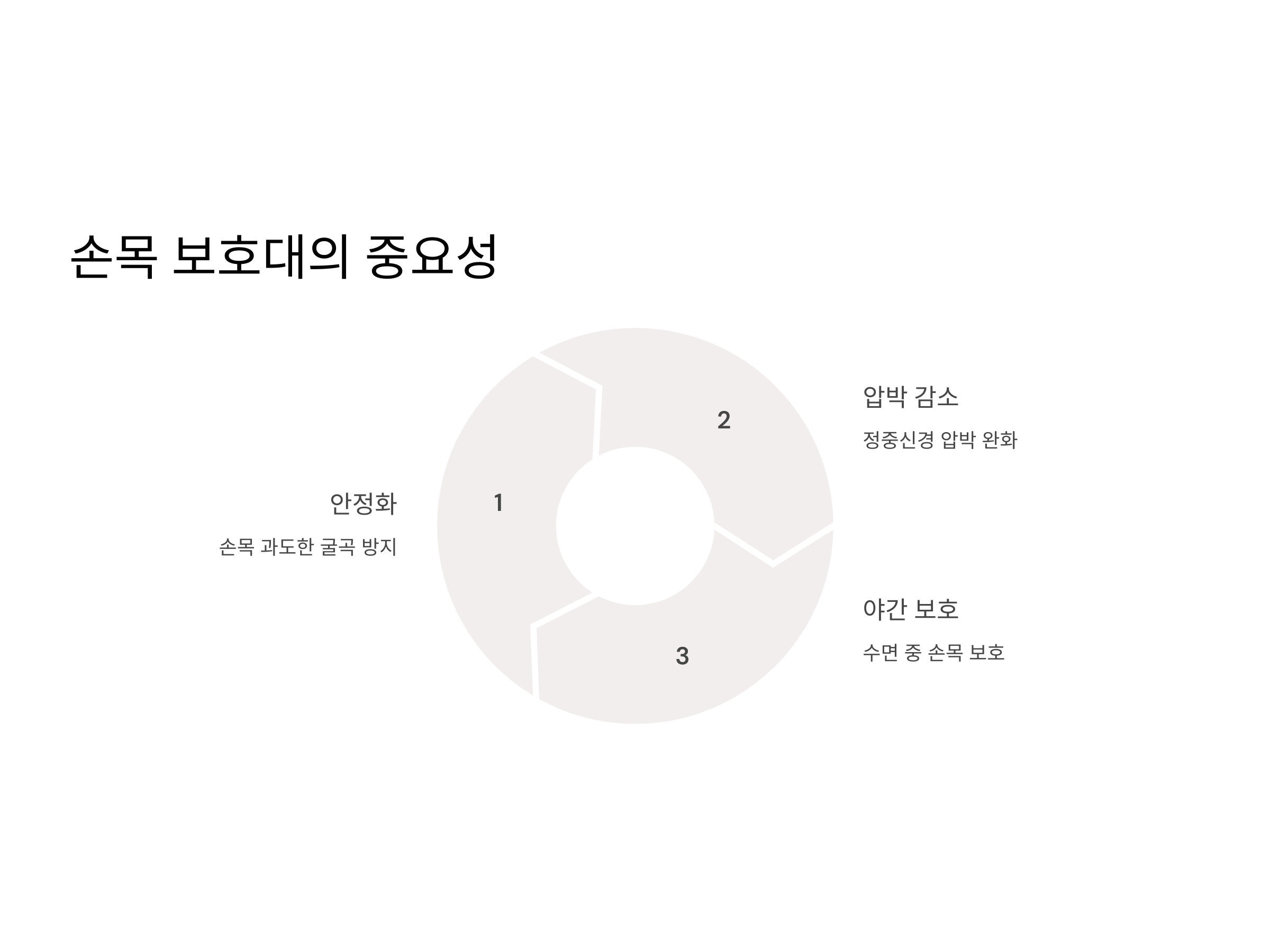손목 보호대는 손목을 일정하게 고정시켜주기 때문에, 불필요한 움직임을 방지하고 손목의 과도한 스트레스를 줄이는 데 도움이 됩니다. 특히, 밤에 손목을 과도하게 굴곡시키지 않도록 도와주는 역할을 하여, 밤 동안 발생할 수 있는 증상의 악화를 방지하는 데 효과적입니다.