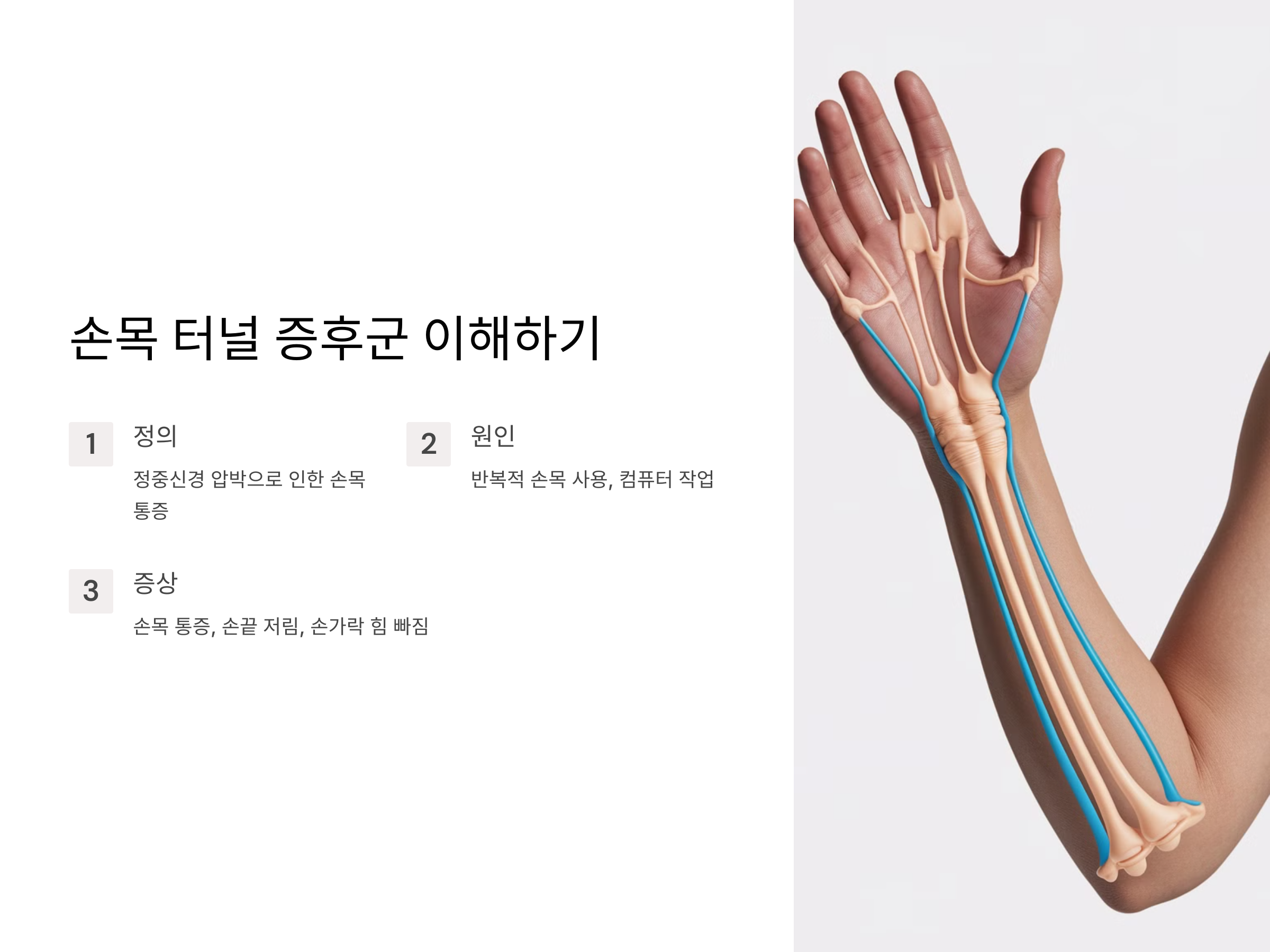 손목 터널 증후군은 손목에 위치한 '손목 터널'이라 불리는 통로를 통해 지나가는 정중신경이 압박을 받을 때 발생합니다. 이 신경이 압박을 받으면 손목과 손에 다양한 증상이 나타납니다. 대표적인 증상으로는 손목의 통증, 손끝의 저림, 그리고 손가락의 힘 빠짐 등이 있습니다.