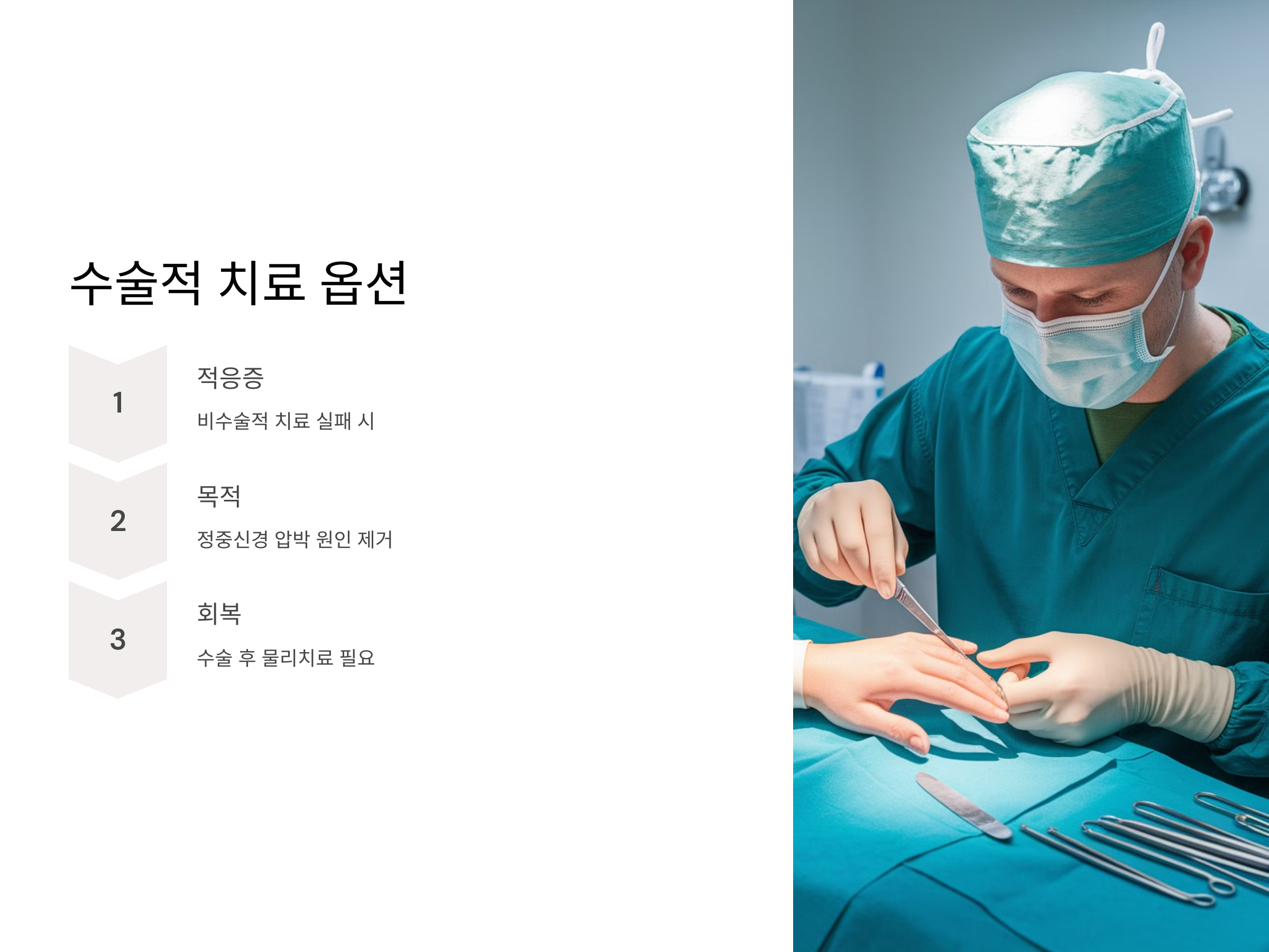 만약 신경 차단술이나 손목 보호대 착용으로 증상이 호전되지 않거나, 증상이 심해진 경우에는 수술적 치료가 필요할 수 있습니다. 수술은 손목 터널 내에서 정중신경을 압박하는 원인을 제거하는 방법으로 진행됩니다. 이 방법은 마지막 수단으로 고려되며, 대부분의 경우 비수술적 방법으로 증상이 개선됩니다.