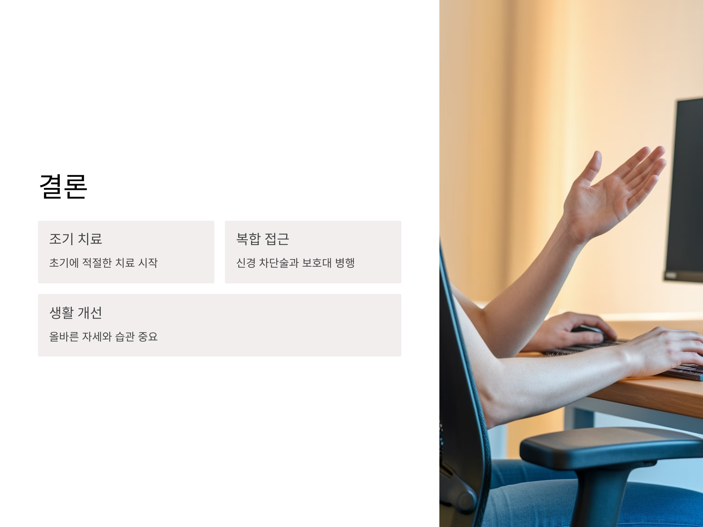 손목 터널 증후군은 초기 단계에서 적절한 치료를 받으면 비수술적인 방법으로도 충분히 개선이 가능합니다. 신경 차단술과 손목 보호대 착용은 증상을 완화하고, 손목의 건강을 회복하는 데 매우 효과적인 방법입니다. 또한, 일상적인 생활 습관 개선과 예방 조치를 통해 손목 터널 증후군을 예방할 수 있습니다. 증상이 악화되기 전에 적절한 치료를 시작하는 것이 중요하며, 지속적인 관리가 필요합니다.