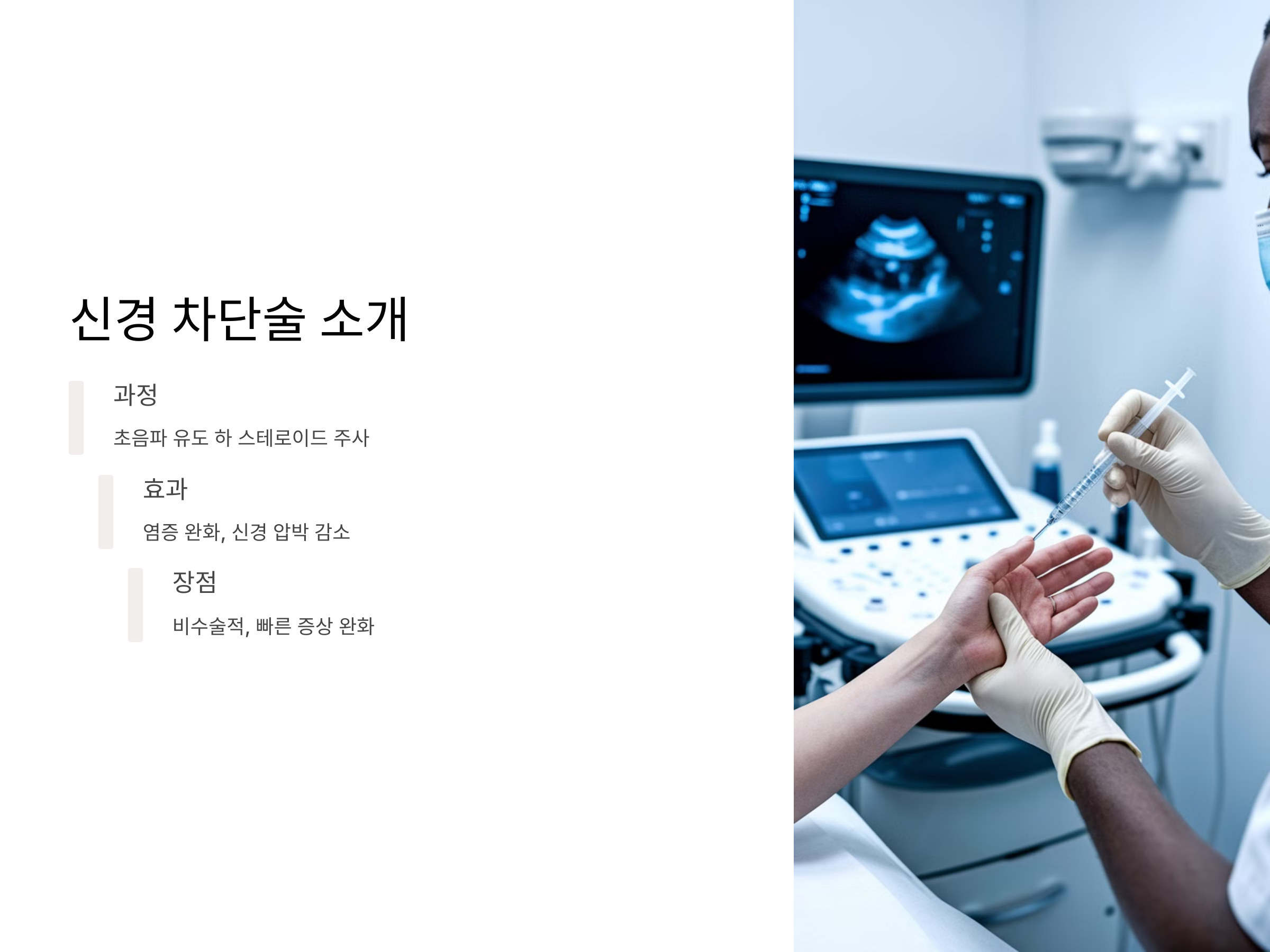 신경 차단술은 손목 터널 증후군 치료에 사용되는 비수술적인 방법 중 하나로, 염증을 줄이고 통증을 완화하는 데 도움을 줍니다. 이 방법은 손목 터널 내에 있는 정중신경에 직접적으로 약물을 주입하는 방식으로, 신경의 염증을 줄여 증상을 완화시킵니다.