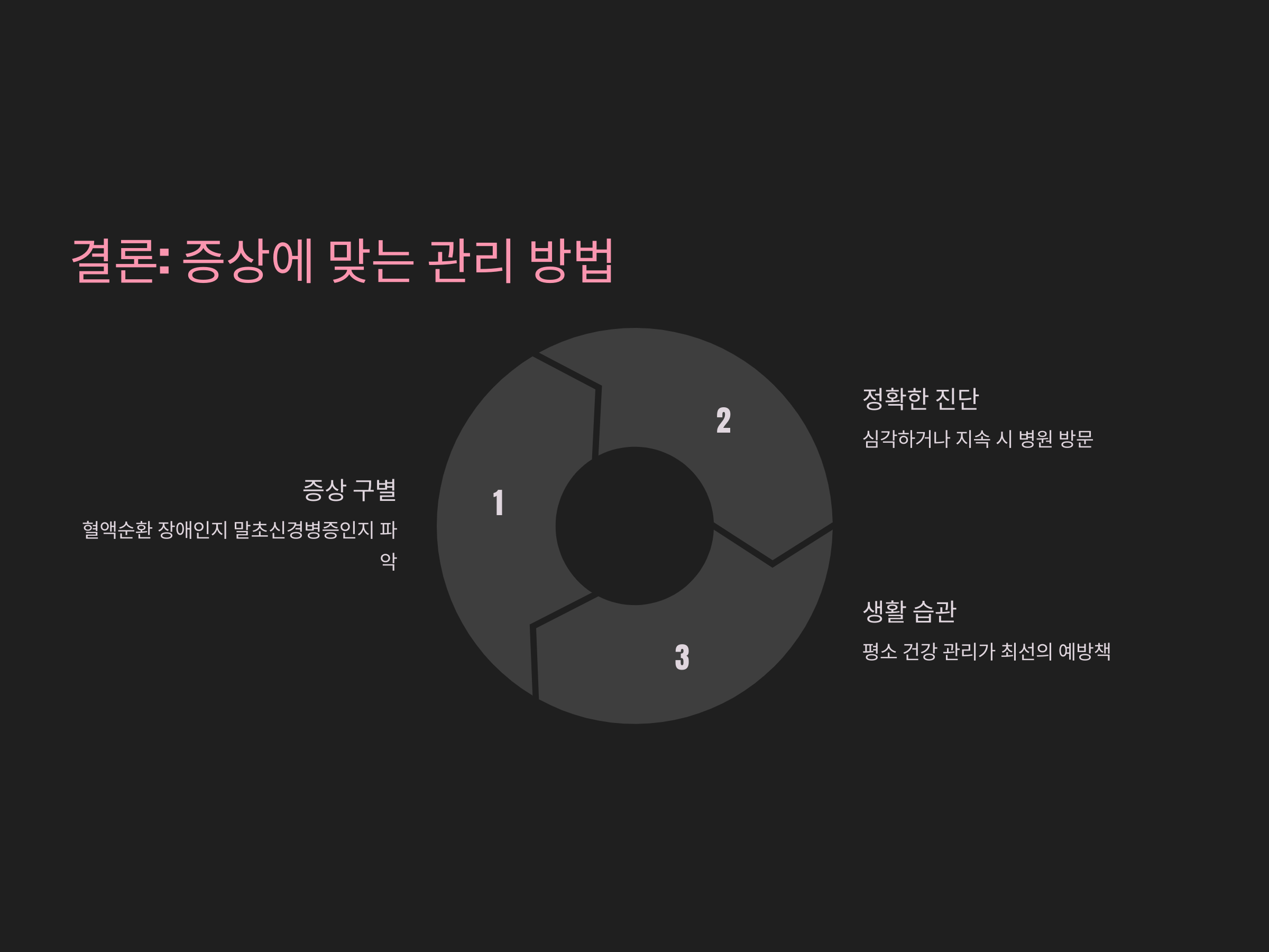 | 주요 증상 | 손발이 차가움, 저림 | 찌릿한 통증, 감각 둔화 |