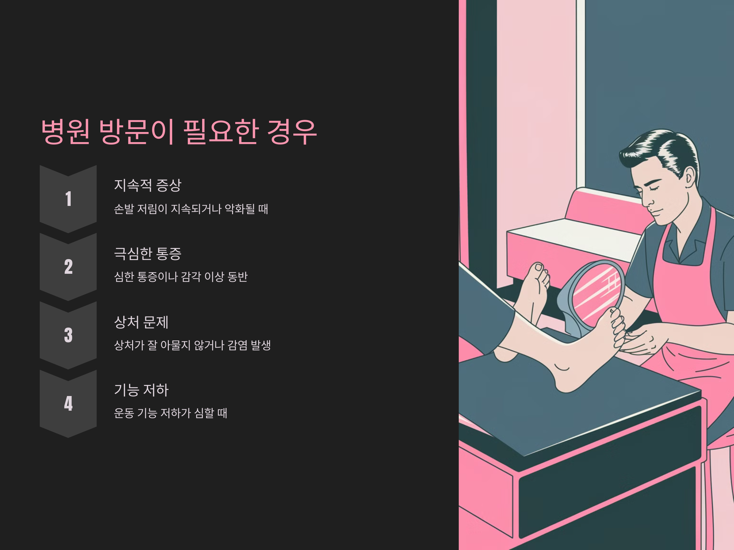 혈액순환 장애와 말초신경병증 모두 초기 치료가 중요합니다. 다음과 같은 경우 반드시 병원을 방문하세요.