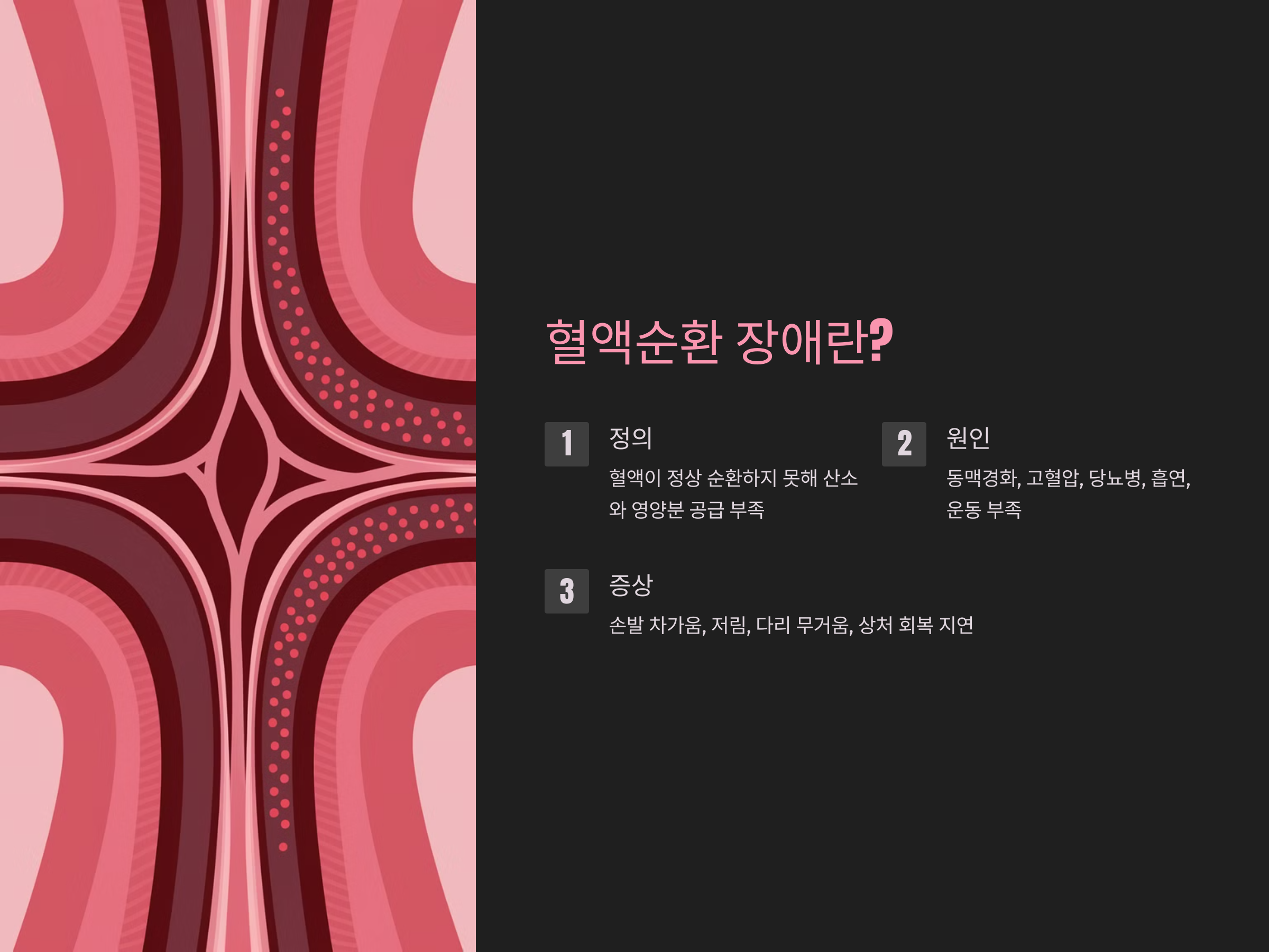 혈액순환 장애는 혈액이 정상적으로 순환하지 못해 조직과 장기에 충분한 산소와 영양분이 공급되지 않는 상태를 의미합니다. 주로 혈관이 좁아지거나 막히는 현상으로 인해 발생하며, 심하면 심혈관 질환으로 발전할 수도 있습니다.
