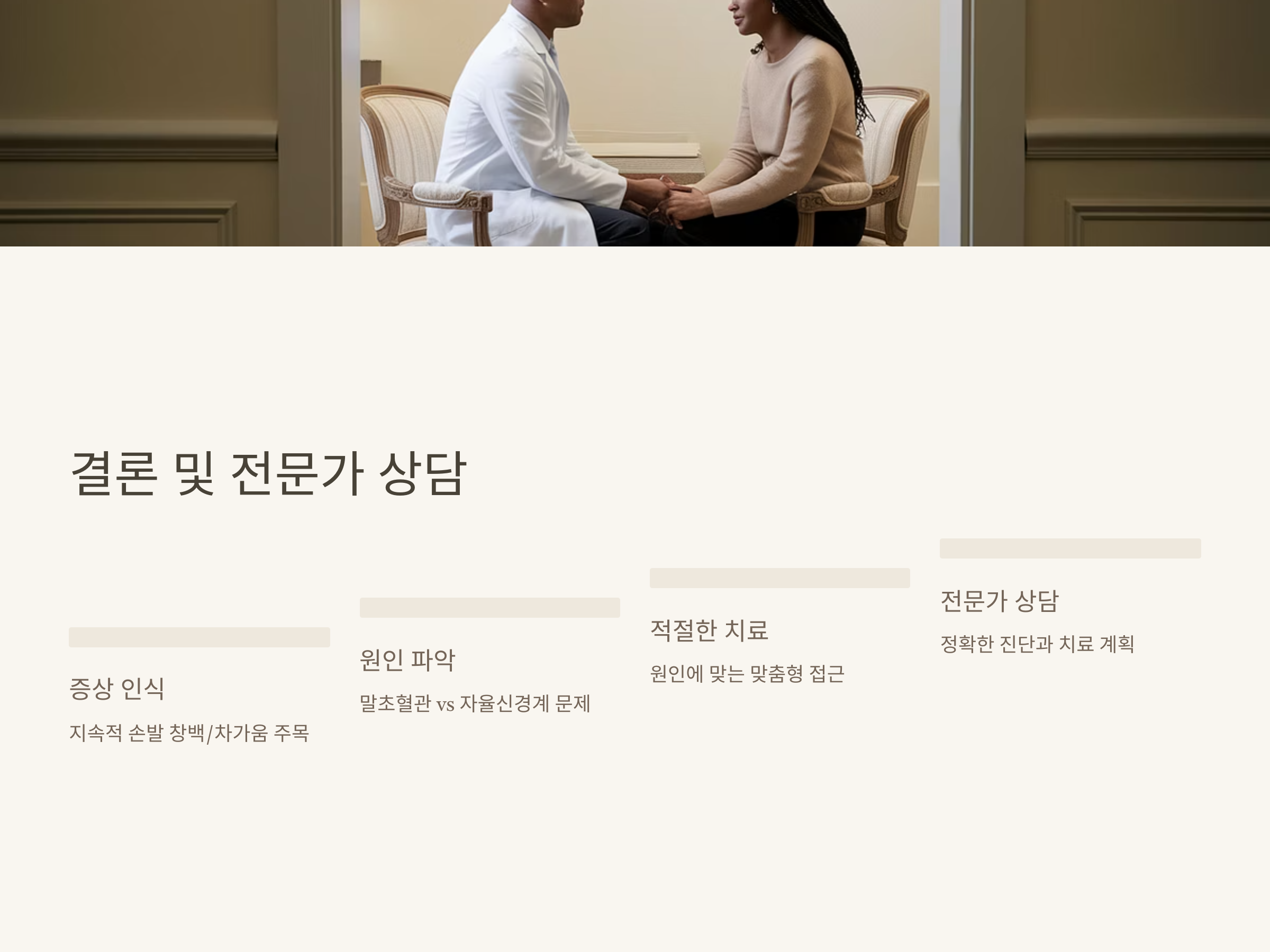 손발이 창백하고 차가운 느낌은 단순한 피로나 날씨 변화로 인한 증상일 수도 있지만, 말초혈관 장애나 자율신경계 문제로 인한 것일 수 있습니다. 이 두 가지 원인에 대한 차이를 이해하고, 각 원인에 맞는 치료와 관리를 통해 증상을 개선할 수 있습니다. 따라서, 손발이 차가운 증상이 지속된다면, 전문가와 상담하여 정확한 진단을 받고 적절한 조치를 취하는 것이 중요합니다.
