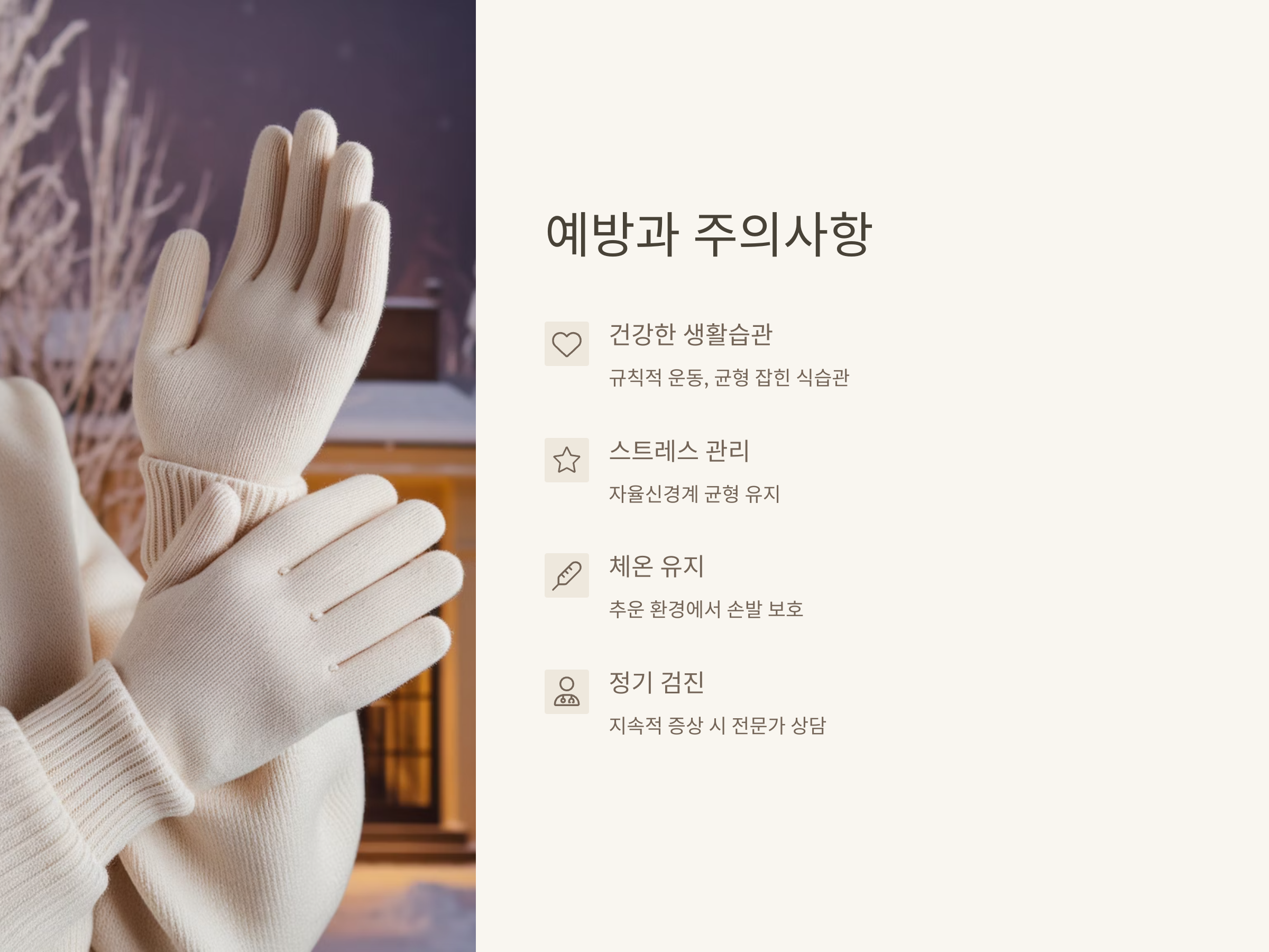 손발이 창백하고 차가운 증상을 예방하려면, 첫 번째로 중요한 것은 건강한 생활습관을 유지하는 것입니다. 규칙적인 운동과 균형 잡힌 식습관은 혈액 순환을 개선하는 데 큰 도움이 됩니다. 또한, 스트레스를 관리하고 충분한 수면을 취하는 것도 자율신경계의 균형을 맞추는 데 필요합니다.