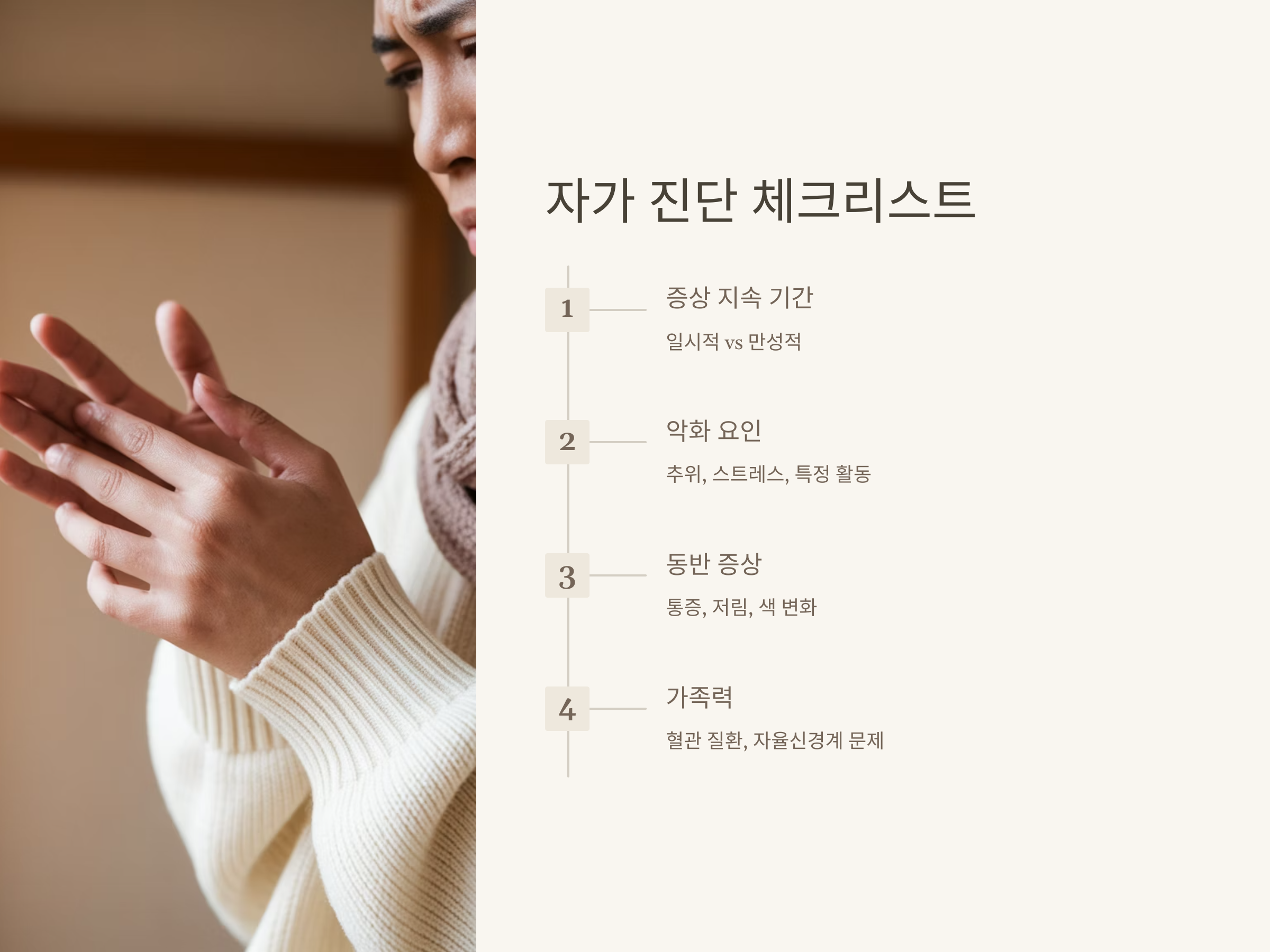 추운 날씨나 차가운 환경에서는 손발을 보호하기 위해 따뜻하게 유지하는 것이 중요합니다. 장기간 손발이 차가운 상태가 지속된다면, 병원에서 정확한 진단을 받고 치료를 시작하는 것이 좋습니다.