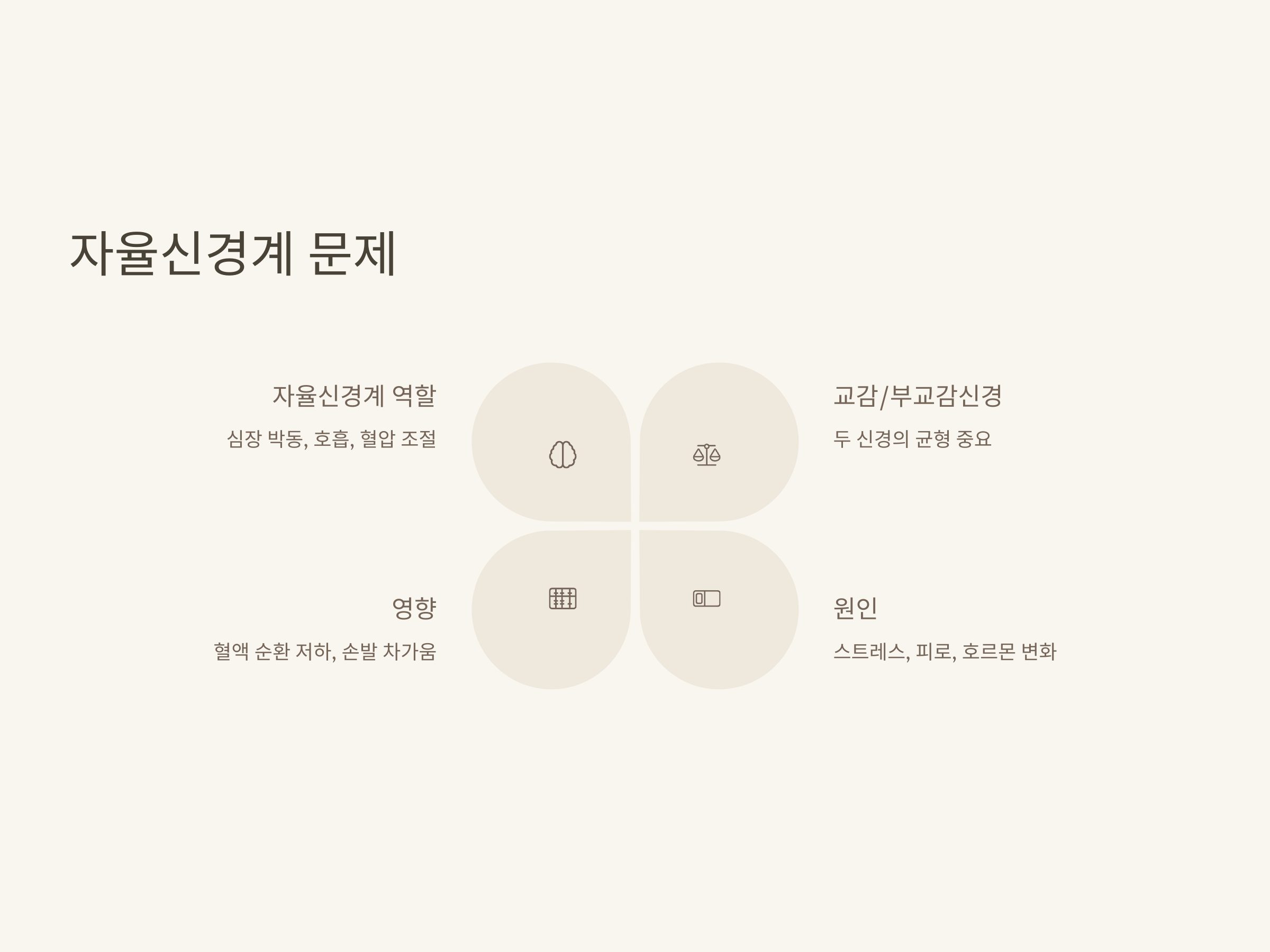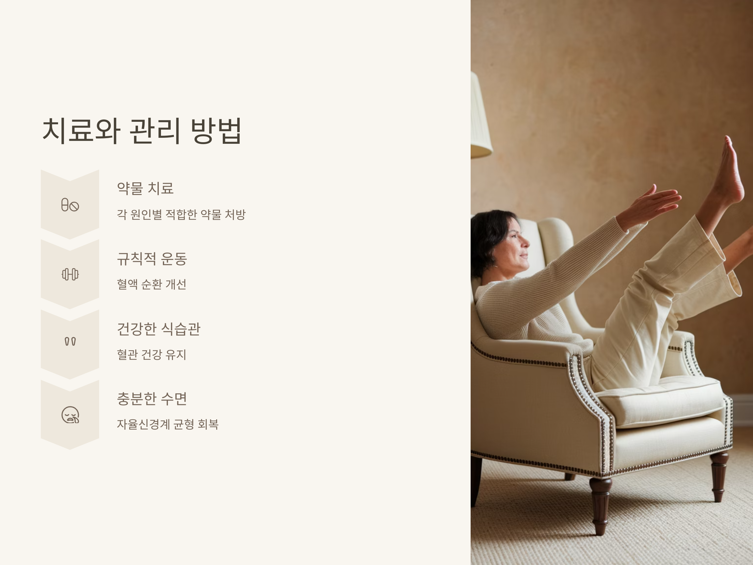 자율신경계 문제가 원인이라면, 스트레스 관리, 충분한 수면, 그리고 적절한 운동이 중요합니다. 또한, 자율신경계의 불균형을 조절하는 약물이나 치료법이 필요할 수 있습니다. 생활습관을 개선하고, 신경계의 균형을 맞추는 방법을 찾는 것이 중요합니다.