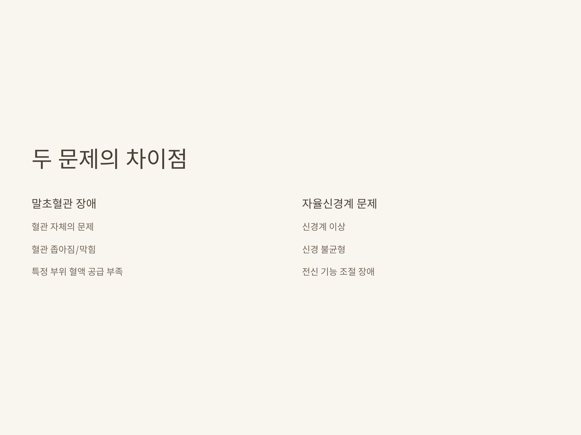 말초혈관 장애와 자율신경계 문제의 주요 차이점은 그 원인과 영향을 미치는 부위에 있습니다. 말초혈관 장애는 혈관의 문제로 인해 발생하며, 혈액 순환이 원활하지 않기 때문에 손발이 차갑고 창백해집니다. 반면, 자율신경계 문제는 신경계의 이상으로 인해 혈액 순환에 영향을 미치고, 이로 인해 비슷한 증상이 발생합니다.