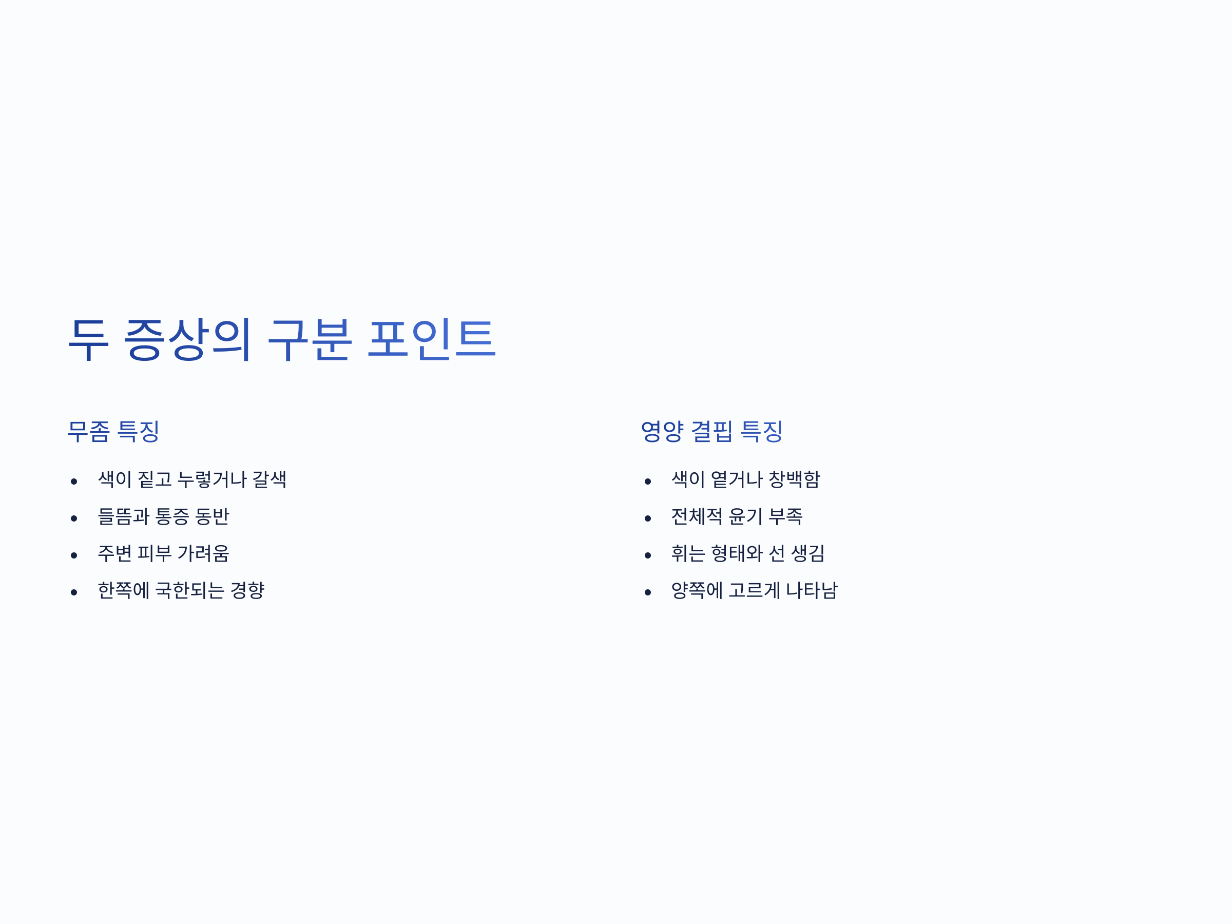 손발톱 무좀과 영양 결핍은 겉보기에는 유사해도 구별 포인트가 분명합니다. 가장 명확한 차이는 다음과 같습니다: