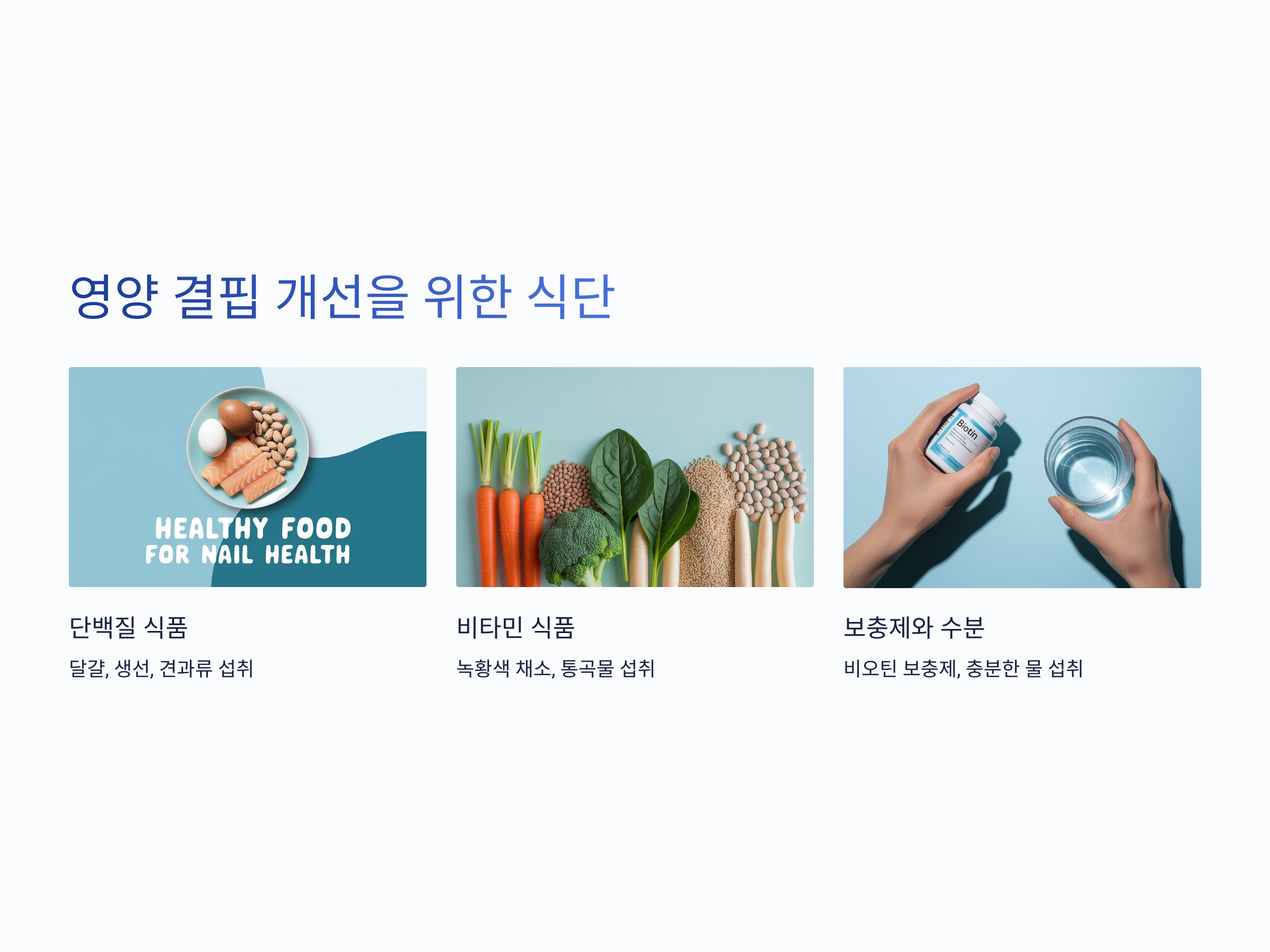 영양 결핍으로 인한 손발톱 문제는 식단 개선이 핵심입니다. 달걀, 생선, 견과류, 녹황색 채소, 통곡물 등 단백질과 비타민이 풍부한 식품을 균형 있게 섭취하는 것이 중요합니다.