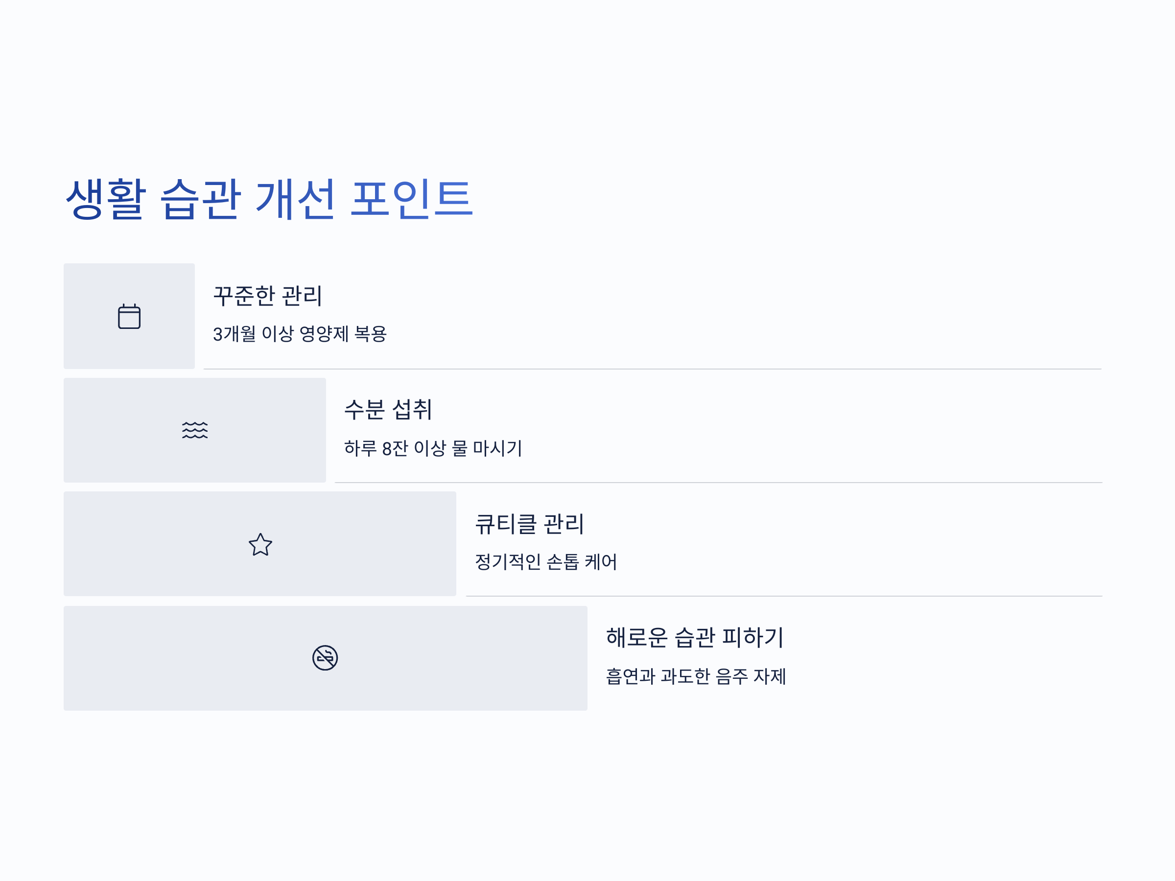 흡연과 음주는 손톱 건강을 악화시키는 요인이며, 무리한 다이어트나 단일 식단 반복도 피해야 합니다. 전체적인 생활 습관을 점검하는 것이 회복의 시작입니다.